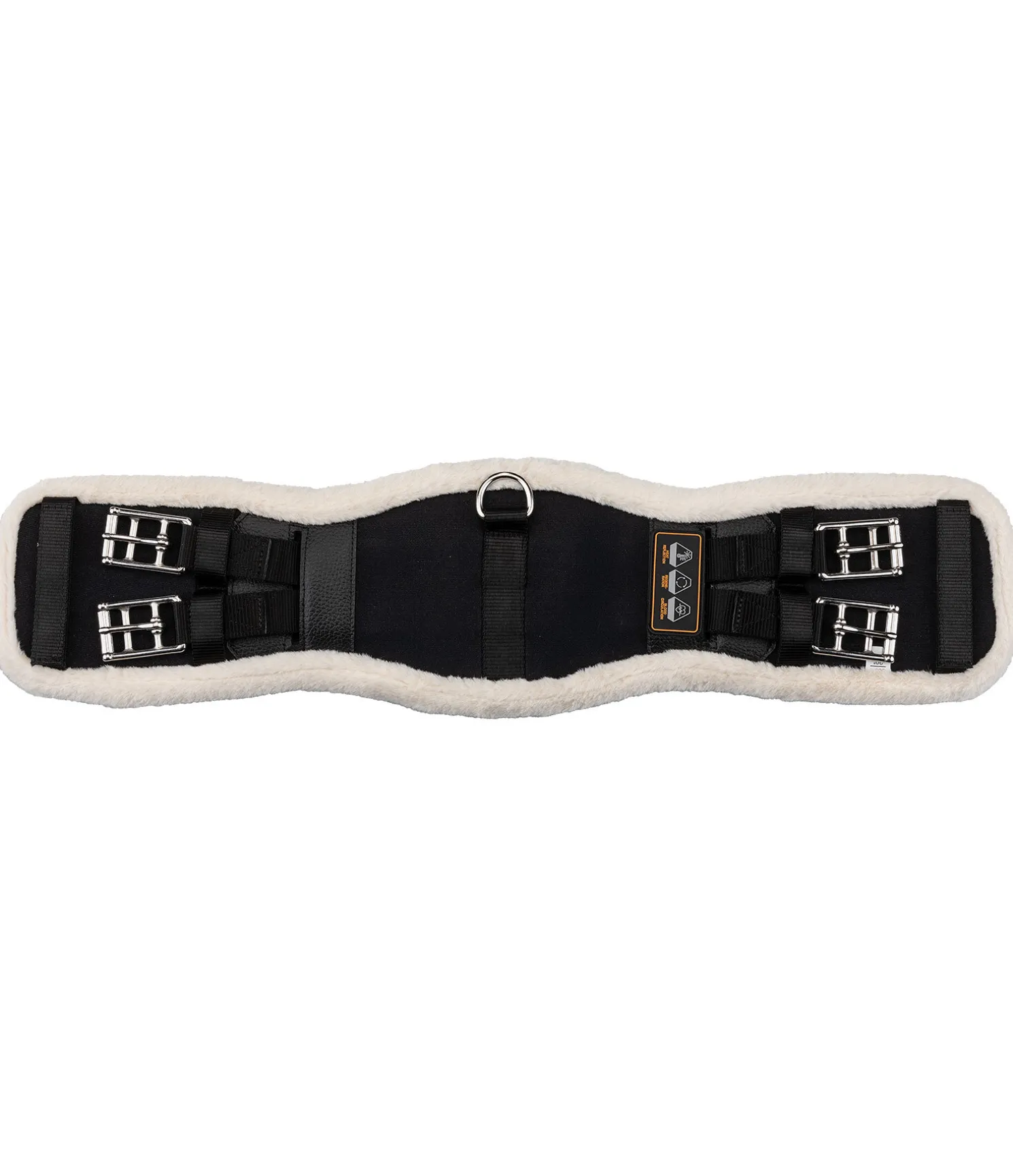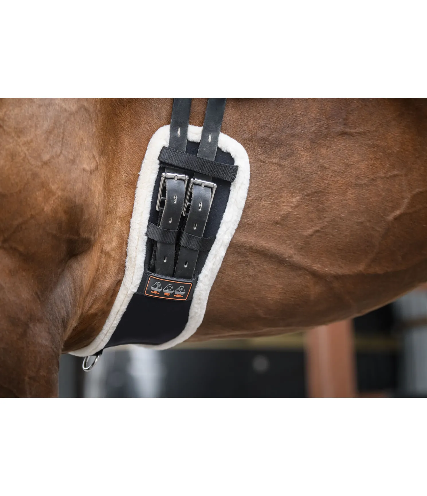 Sangle de dressage anatomique. Doublure intérieure en tissu Air Mesh respirant avec fibres de céramique favorisant la circulation sanguine. Peut ainsi prévenir ou soulager les tensions dans les muscles. Doublure douce en polaire Teddy afin de prévenir les irritations dues aux frottements. Sans insert élastique. Anneau en D central et boucles à rouleau en acier inoxydable. Lavable en machine à 30°C (fermer les pattes auto-agrippantes et utiliser un petit sac de lavage pour protéger le tambour de la machine à laver des boucles en métal). Largeur de la sangle : 11-14,5 cm. Matière extérieure 100 % caoutchouc chloroprène. Doublure intérieure en fourrure Teddy 100 % polyester.
