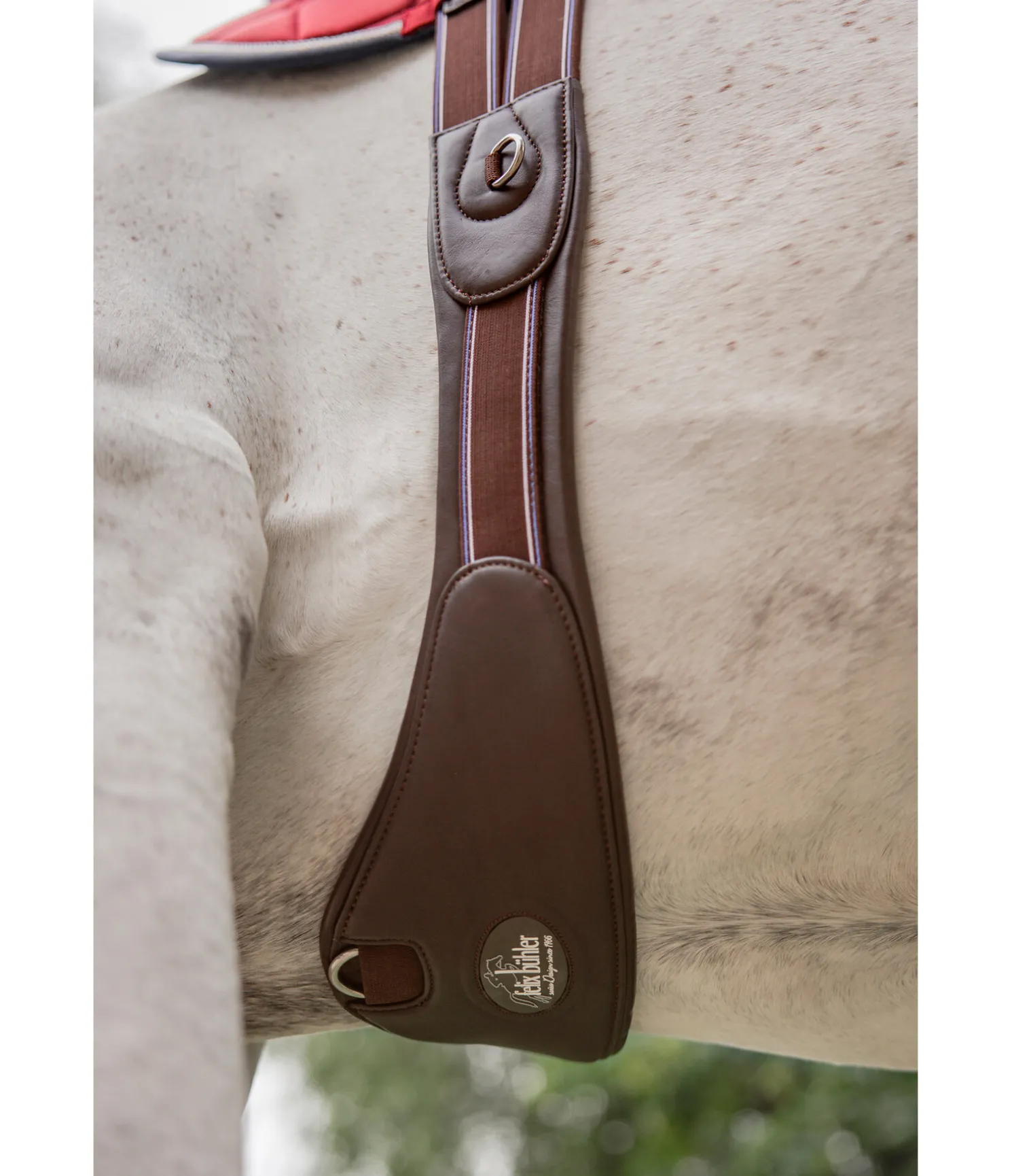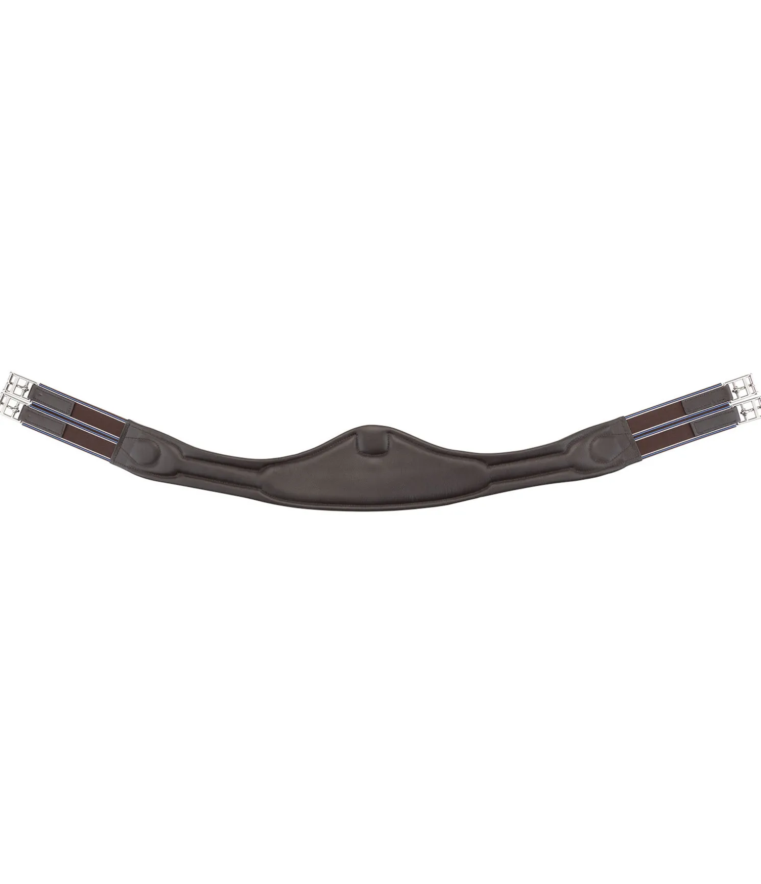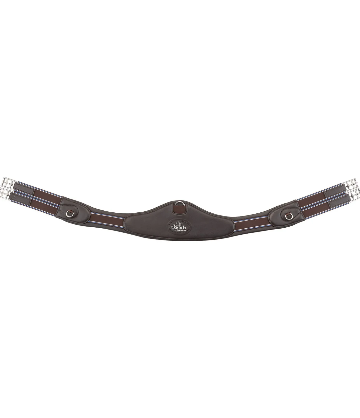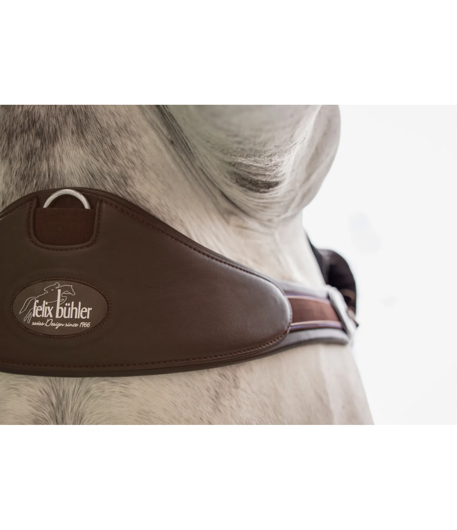 Sangle demi-lune de grande qualité pour une liberté optimale des épaules et des coudes. Élaborée en cuir de qualité supérieure, particulièrement doux et souple. Anneau en D central protégé et boucles à rouleau en acier inoxydable. Bouclerie argentée. Empiècements élastiques des deux côtés. Largeur 7 à 15 cm.