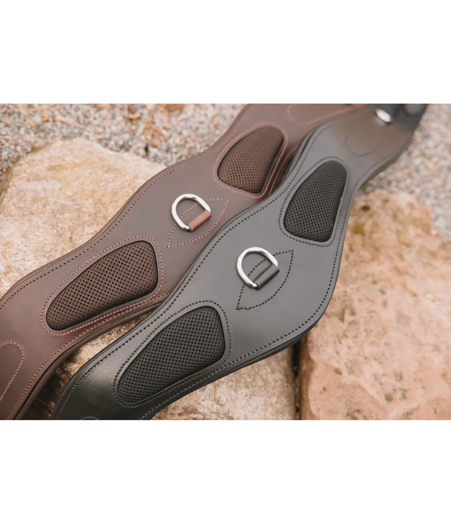 Sangle en cuir anatomique avec doublure douce. Trois anneaux en D, empiècements élastiqués des deux côtés et boucles à rouleau. Largeur de la sangle 8,5 à 13 cm.