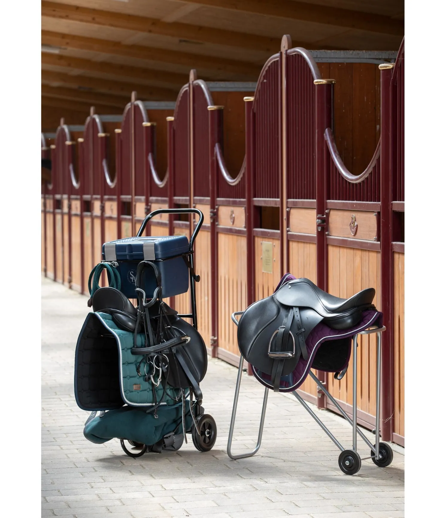Chariot porte-selle maniable et solide. Monté sur roulettes, en acier creux, avec supports pour la selle, la briderie et pour le coffre de pansage. Parfaitement adapté à notre coffre de pansage Lissabon, il s’utilise à l’écurie, en concours ou en voyage. 130 x 58 x 38 cm. Insert pour coffre de pansage 30 x 40 cm. Pliable.