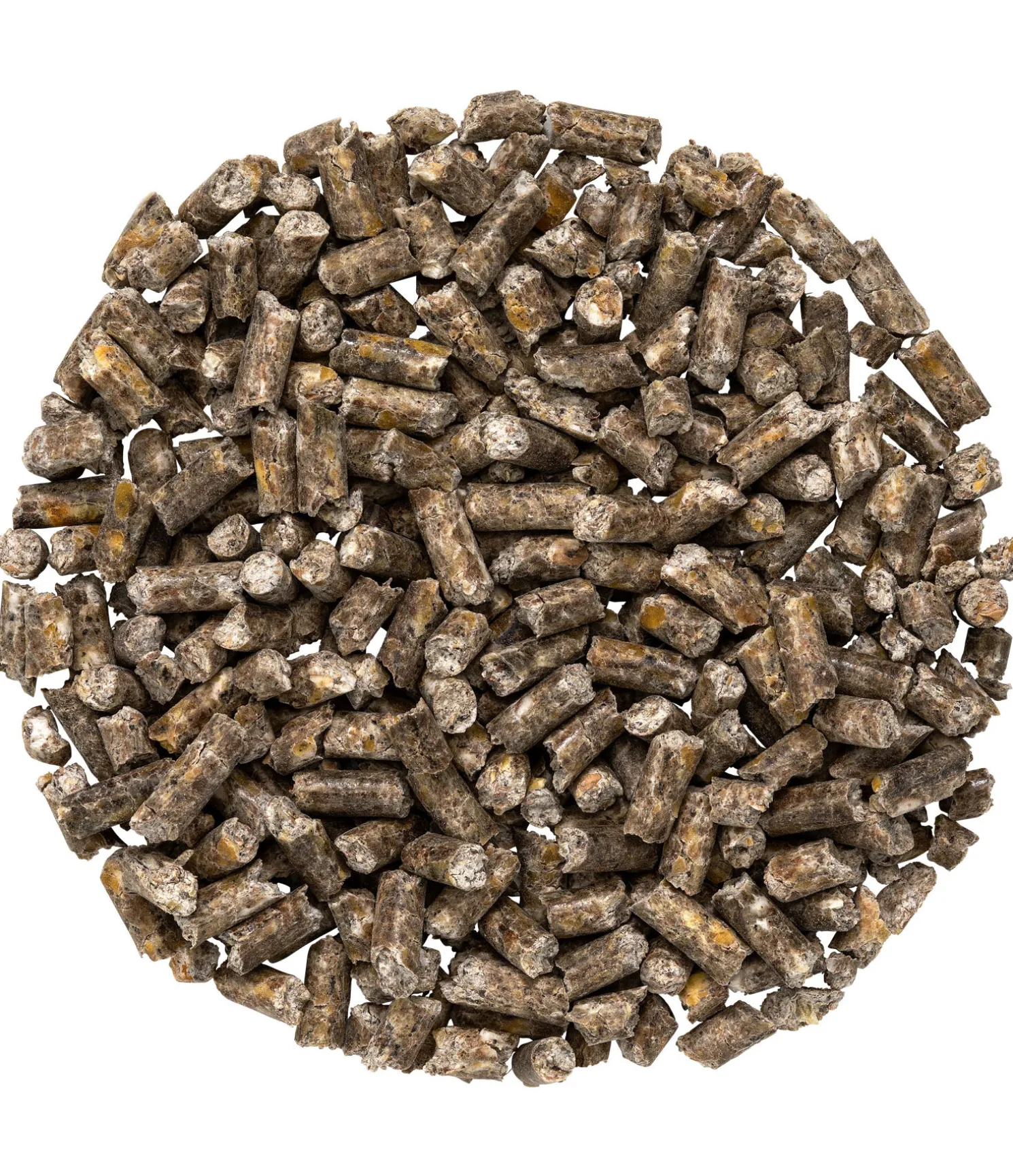 Composition : graines de lin 10 %, maïs 10 %, orge 10 %, tournesol 5 %, marc de fruits 5 %, mélasse 5 %, levure de bière 5 %.