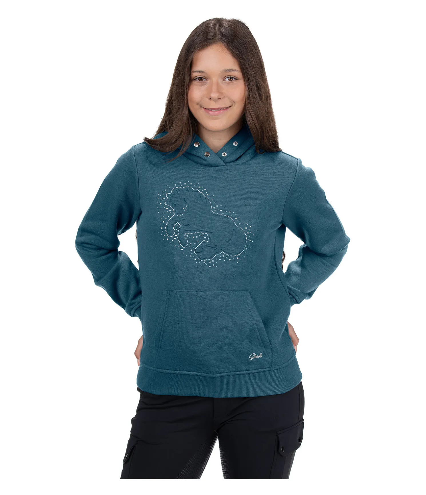 Superbe sweat à capuche avec imprimé en relief et strass aux couleurs de l’arc-en-ciel sur la poitrine. Capuche qui peut être fermée par boutons-pression. Agréablement doux grâce à son intérieur molletonné. Poche kangourou avec broderie STEEDS discrète. Bord des manches et taille en maille côtelée fine. 65 % polyester, 35 % coton.