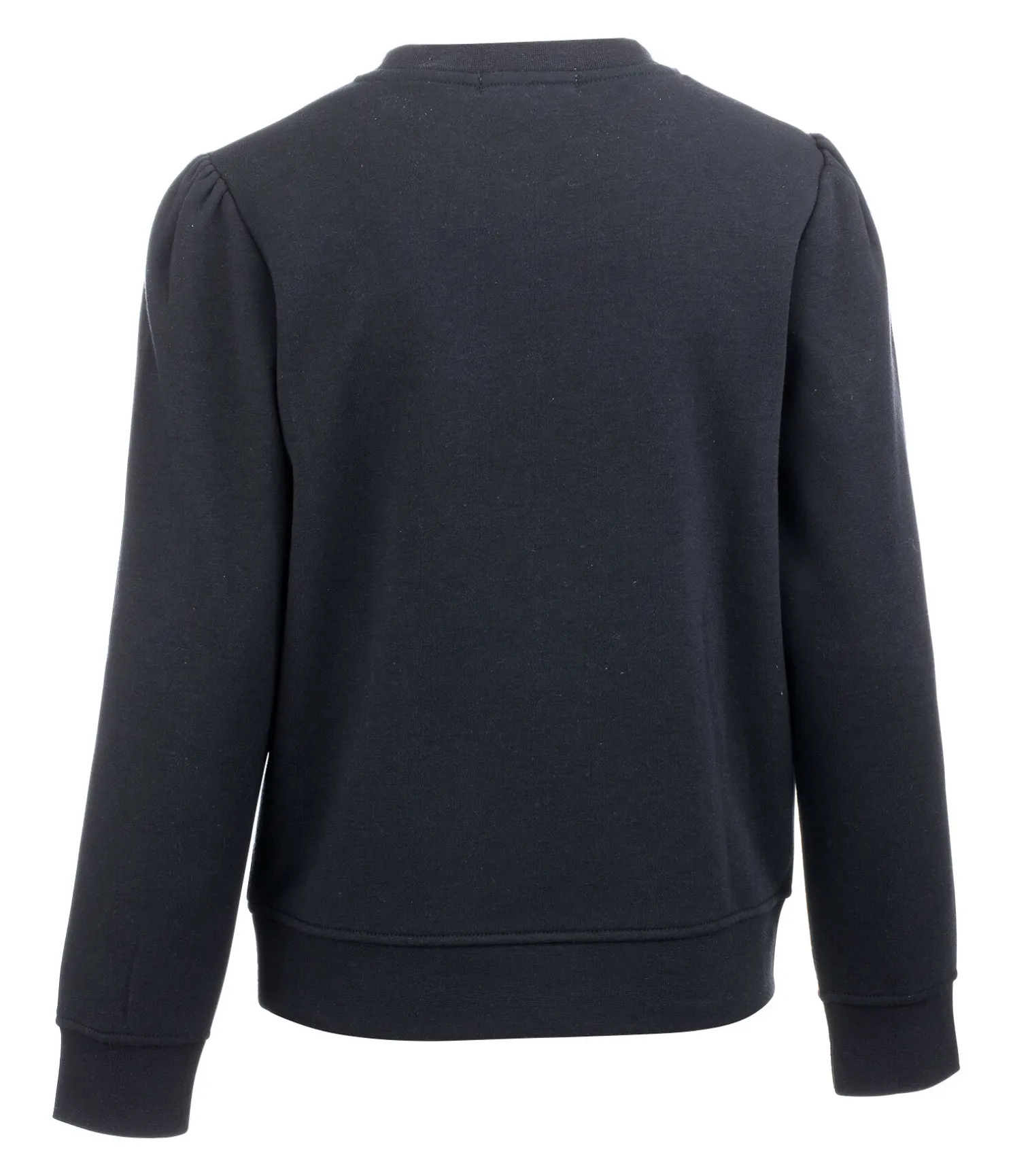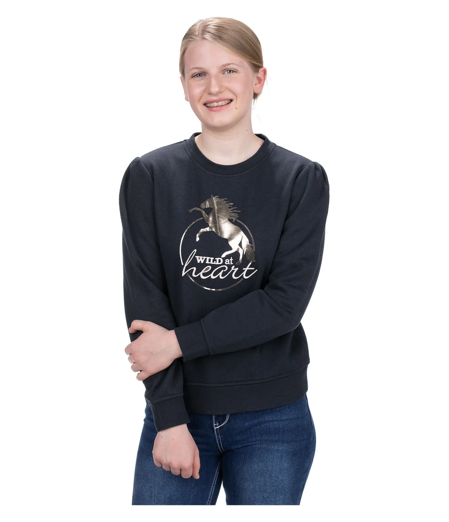 Joli sweat avec épaules bouffantes. Motif western scintillant avec inscription brodée sur la poitrine. 65% polyester, 35% coton.