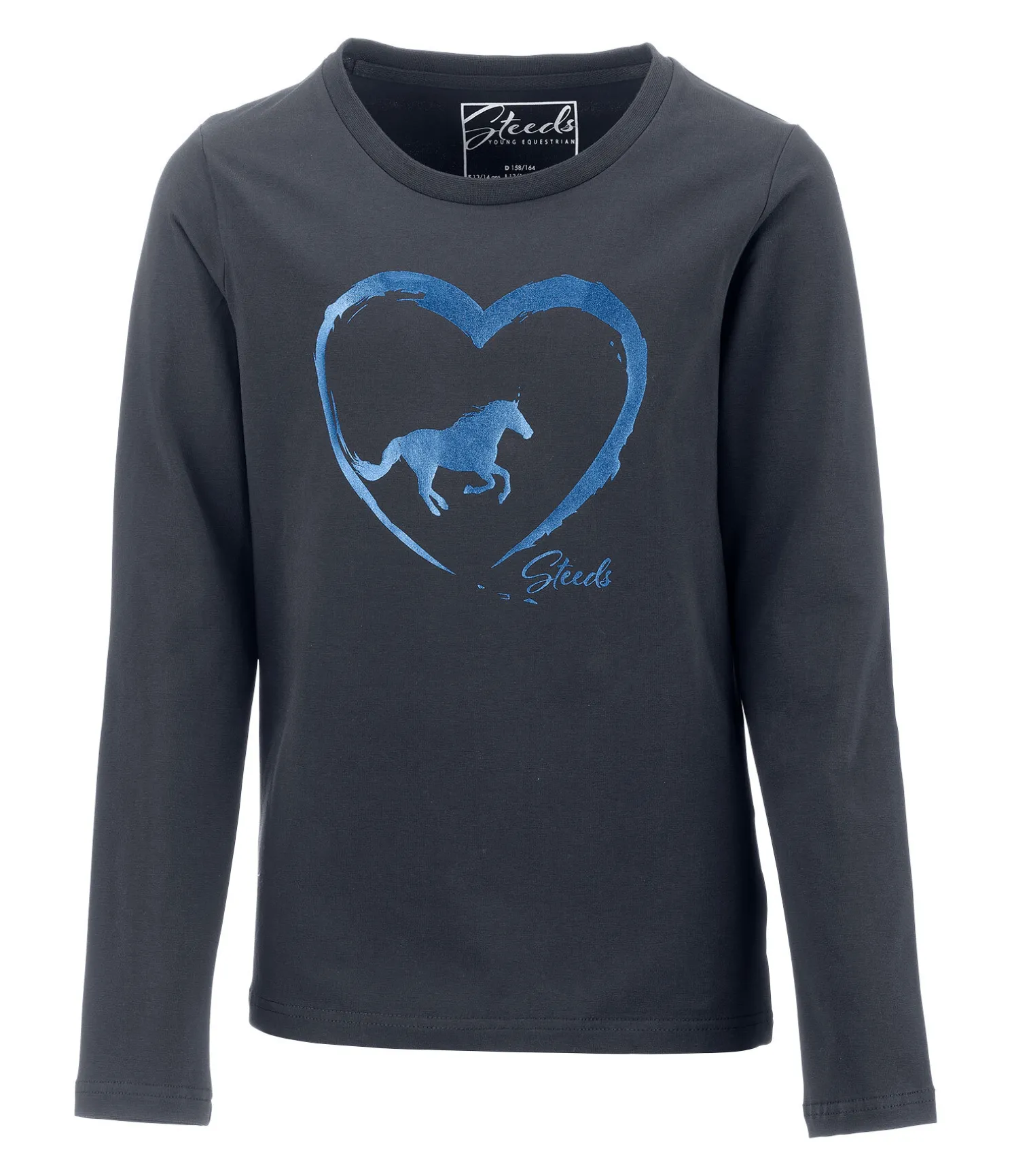 Joli T-shirt à manches longues. Col rond. Motif coeur scintillant et cheval sur la poitrine.100% coton.