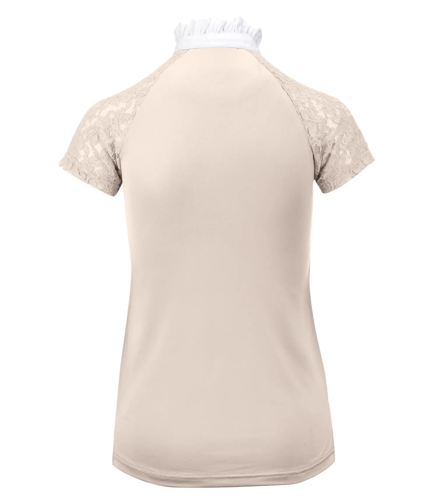 T-shirt de concours technique. Matière très extensible, respirante à séchage rapide. Manches en dentelle douce. Col volanté. Broderie Felix Bühler sur la poitrine et boutons paillettés. 88 % polyester, 12 % élasthanne.