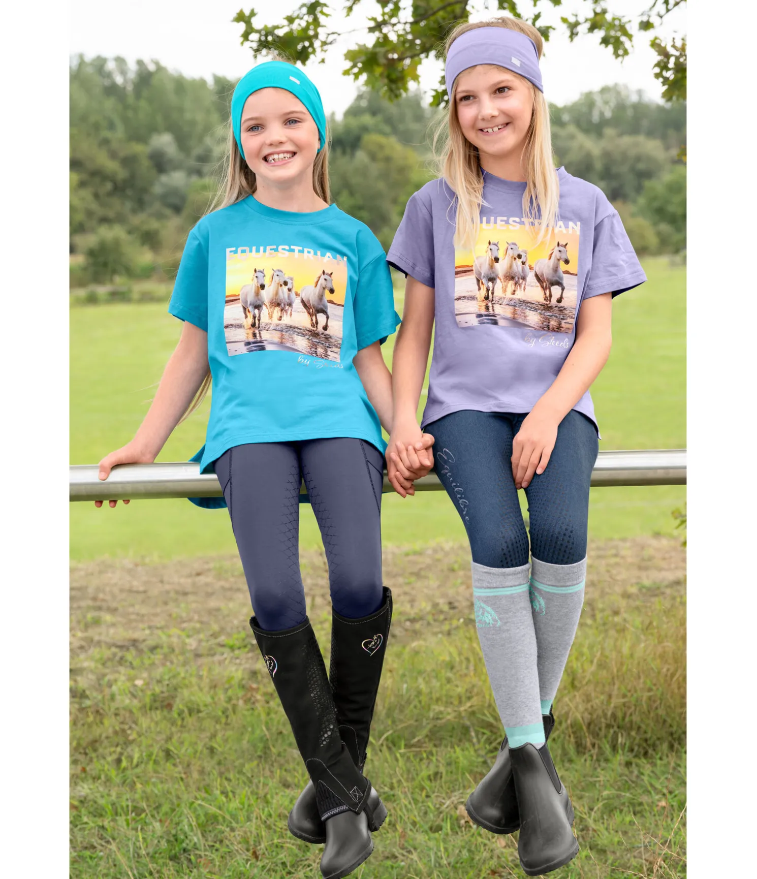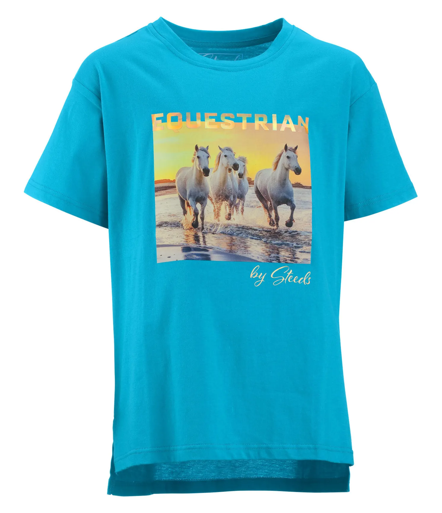 T-shirt décontracté à col rond. Grand imprimé à l’avant avec slogan « EQUESTRIAN » métallisé. Coupe légèrement plus longue à l’arrière. 100 % coton.