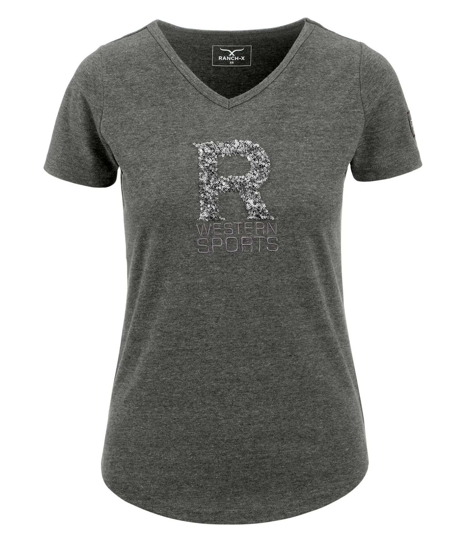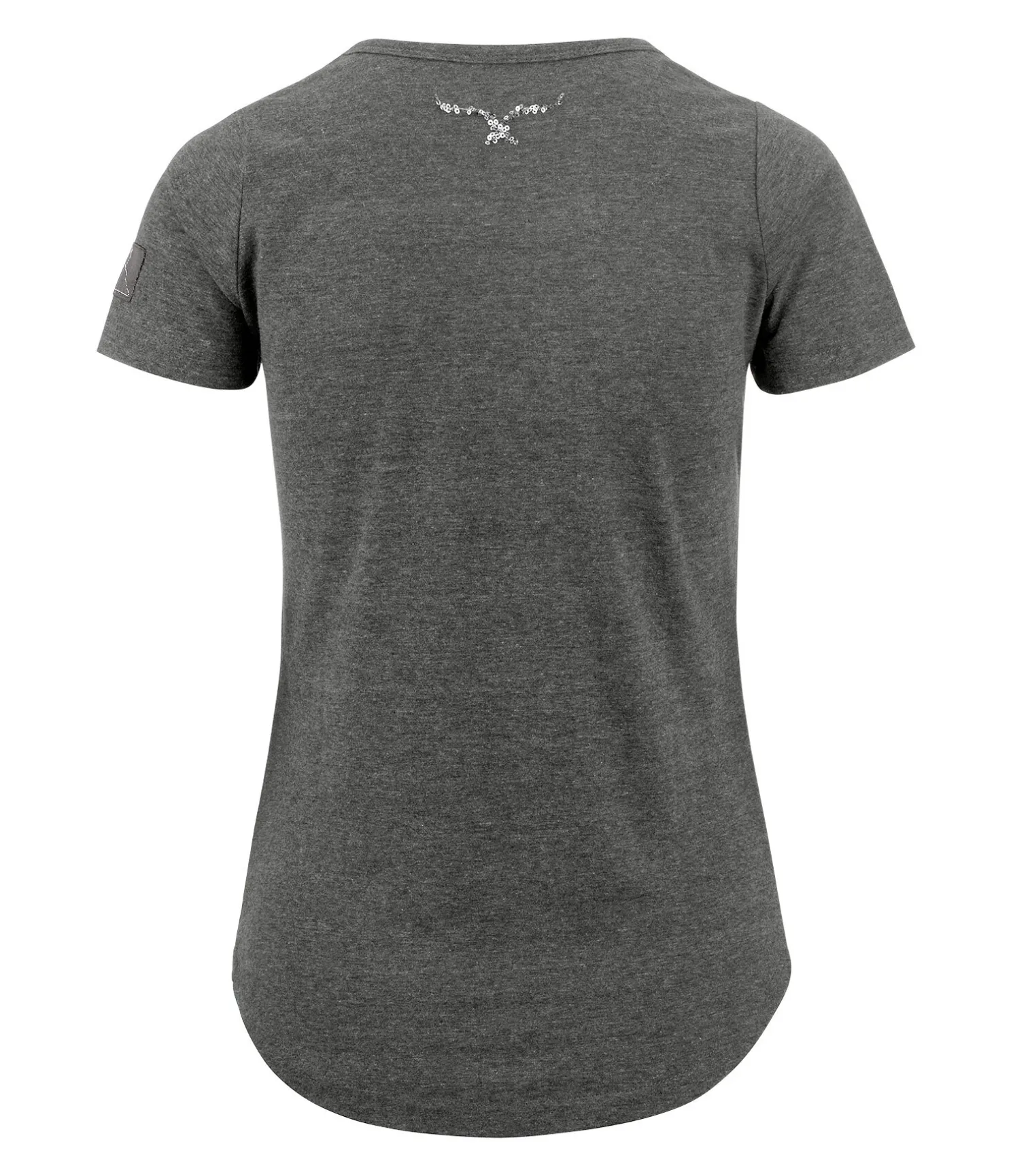 T-shirt col-V. Coupe ample et matière respirante. Motif à paillettes. 65 % polyester, 35 % coton.