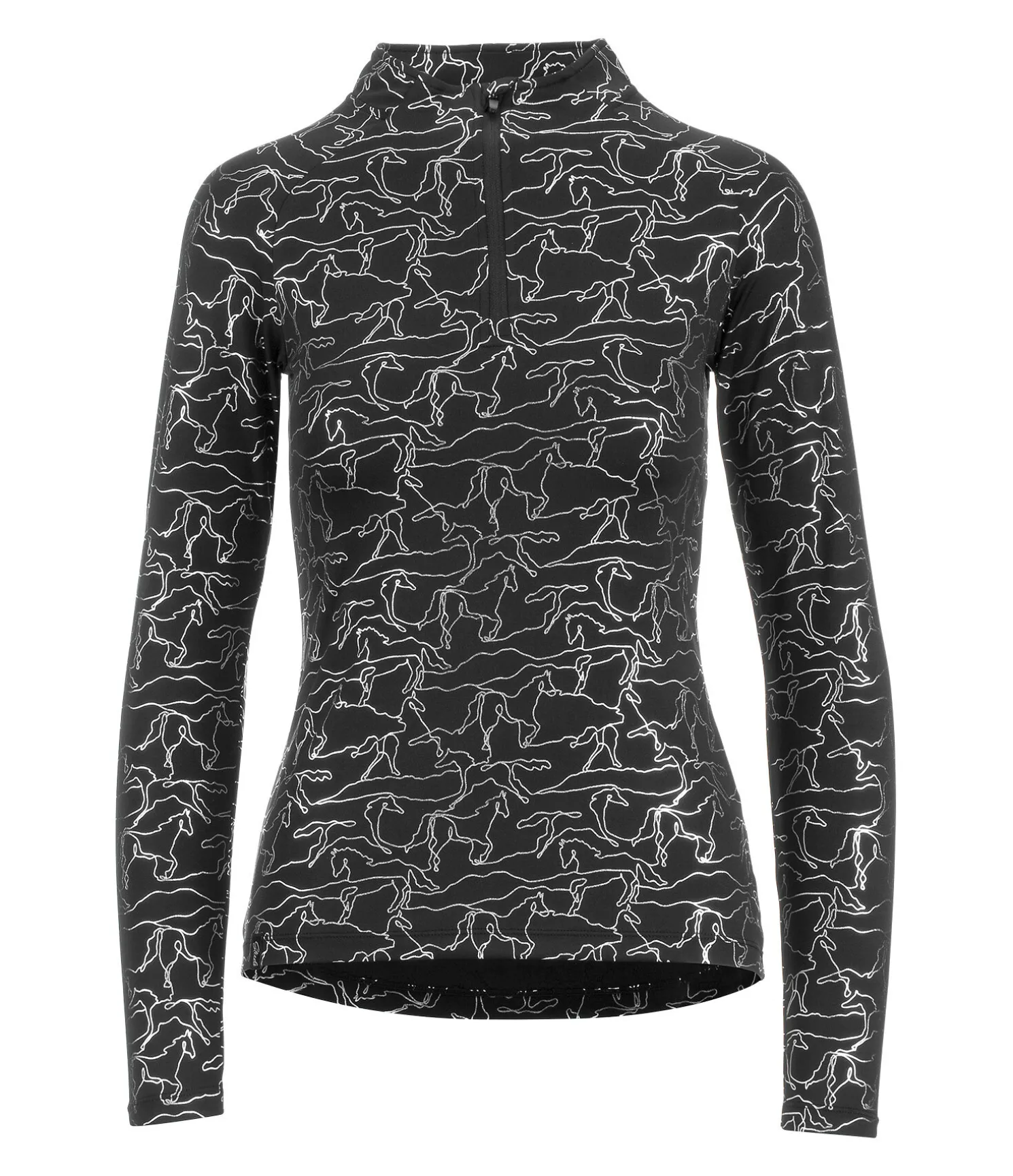T-shirt technique à manches longues. Imprimé métallisé cheval all-over. Manches raglan. Col montant zippé avec protège-menton. Matière respirante. Séchage rapide. 88 % polyester, 12 % élasthanne.