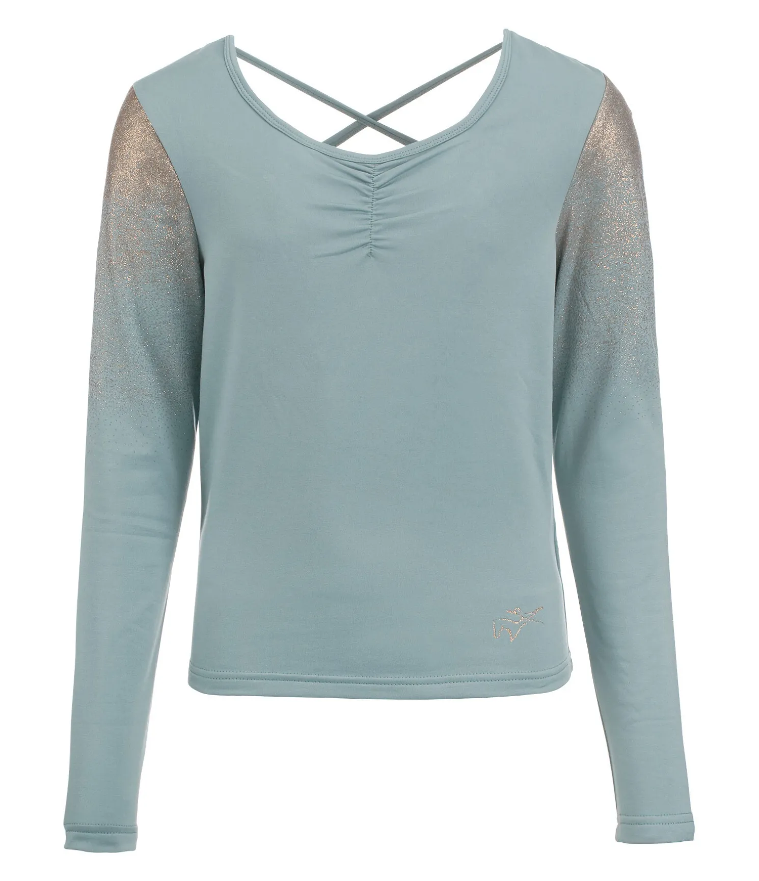 T-shirt avec large col rond. Intérieur molletonné et chaud. Découpe en V avec lanières croisées dans le dos. Superbe dégradé scintillant rose doré partant de l’épaule. Matière respirante à séchage rapide. 80 % nylon, 20 % élasthanne.