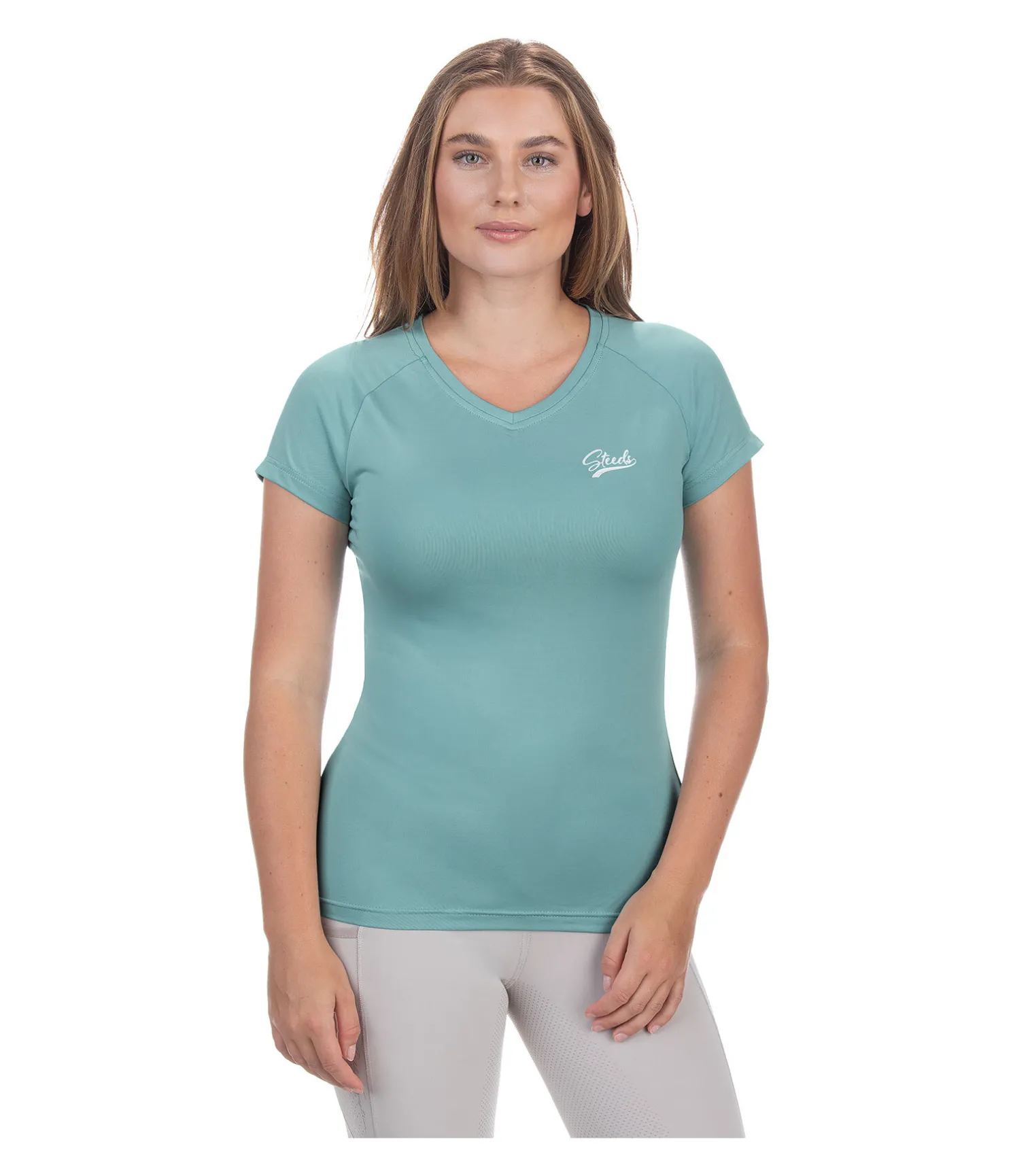 T-shirt col en V à manches courtes. Doux et extensible. Matière respirante à séchage rapide. Imprimé argenté sur la poitrine. 88 % polyester, 12 % élasthanne.