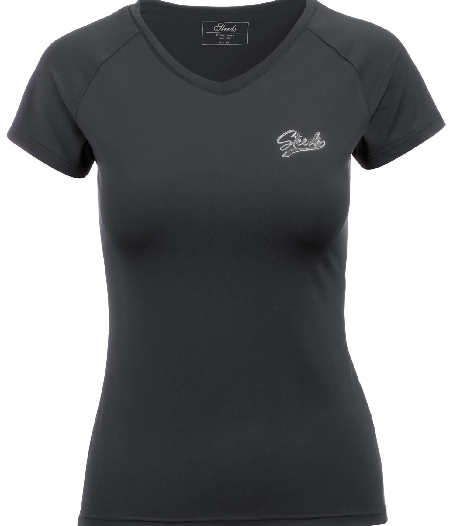T-shirt col en V à manches courtes. Doux et extensible. Matière respirante à séchage rapide. Imprimé argenté sur la poitrine. 88 % polyester, 12 % élasthanne.