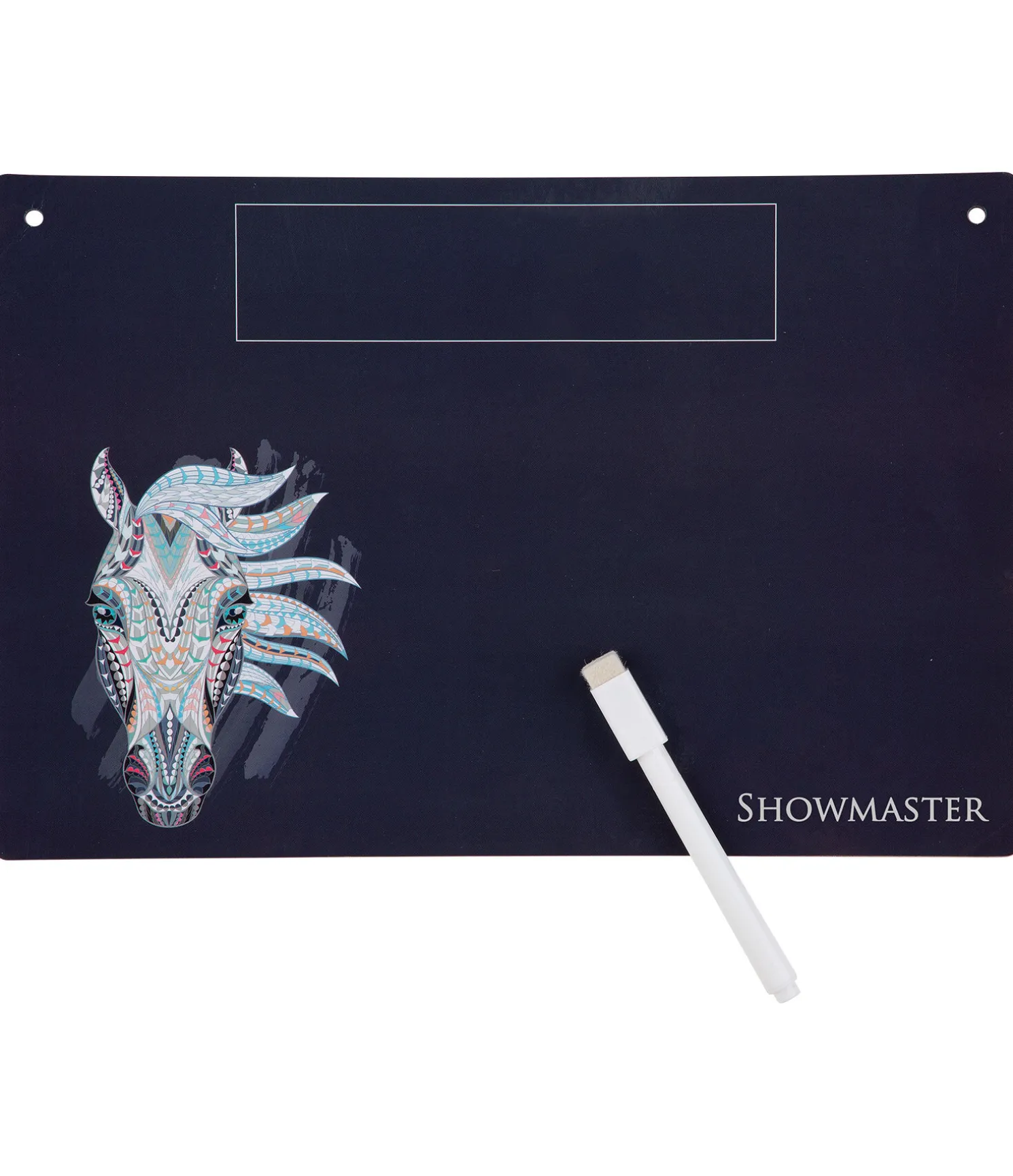Tableau d’écurie effaçable décoré d’un motif tête de cheval. Livré avec marqueur effaçable magnétique. Dimensions 30 cm x 20 cm.