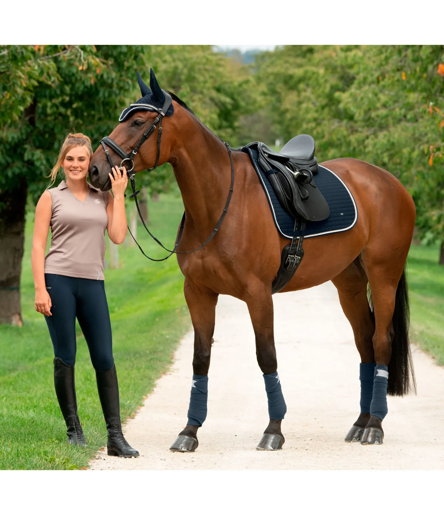 Tapis de selle en coton sobre et indéformable grâce au matelassage resserré, avec bordure colorée et petite plaque métallique argentée avec logo gravé. Passants de sangle et de contre-sanglons avec patte auto-agrippante pratique. Dessous en Air mesh respirant et absorbant l’humidité. Dessus 100 % coton, rembourrage et dessous 100 % polyester.