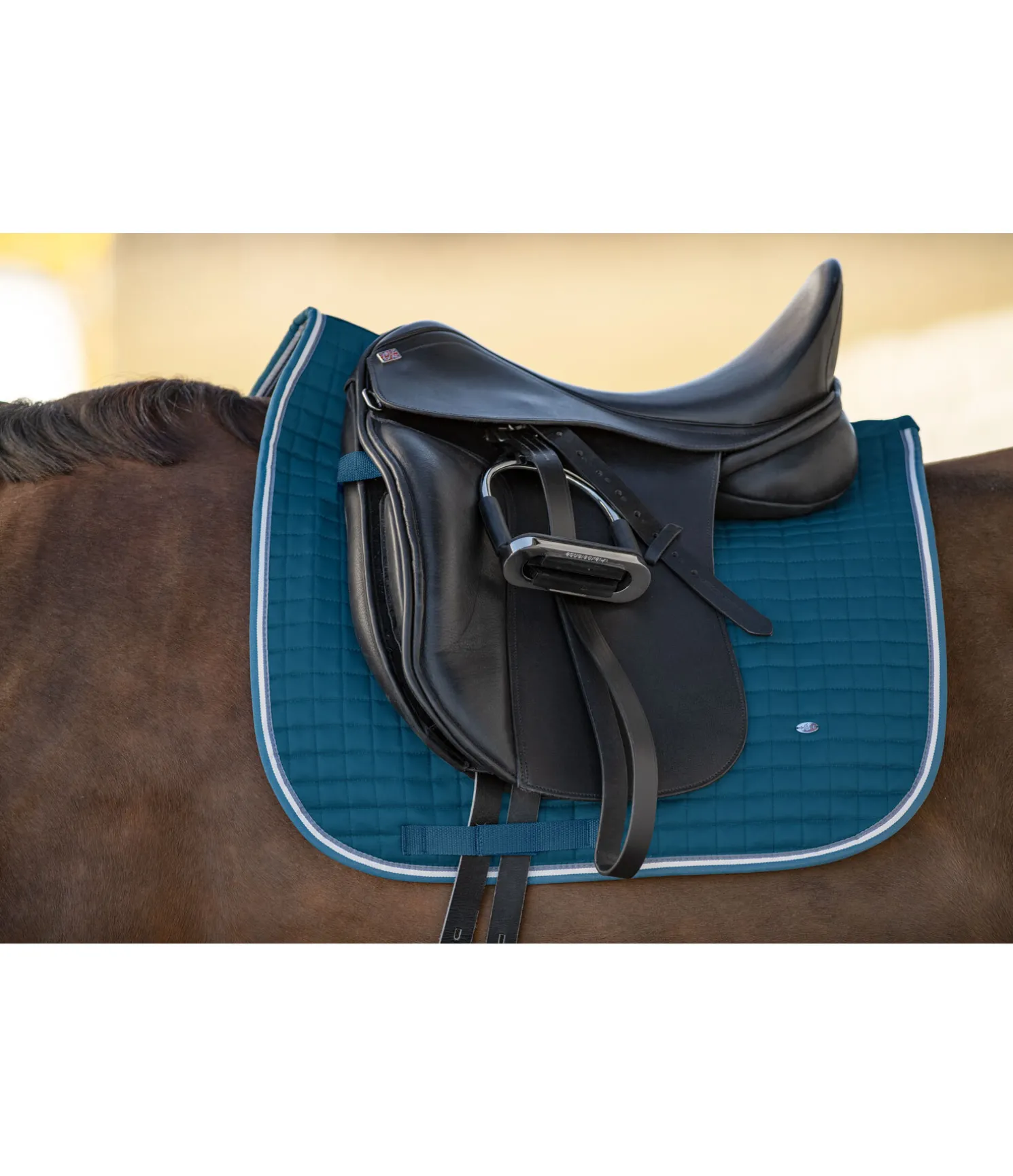 Tapis de selle en coton sobre et indéformable grâce au matelassage resserré, avec bordure colorée et petite plaque métallique argentée avec logo gravé. Passants de sangle et de contre-sanglons avec patte auto-agrippante pratique. Dessous en Air mesh respirant et absorbant l’humidité. Dessus 100 % coton, rembourrage et dessous 100 % polyester.