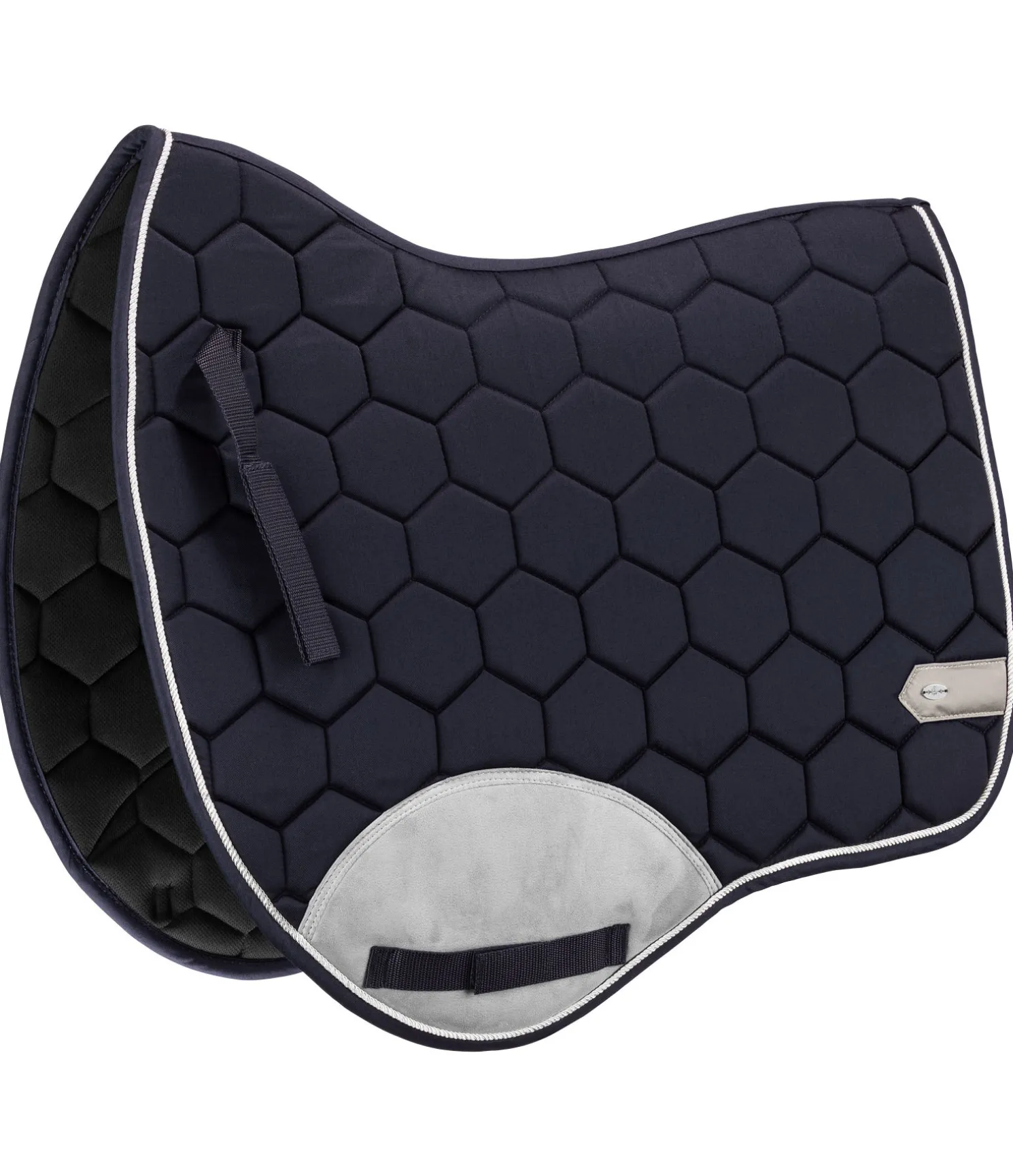 Tapis de selle dans une coupe sportswear avec protection contre les frottements de couleur contrastante à l’aspect velours au passage de sangle. Petite plaque argentée filigrane avec logo gravé de chaque côté et cordon décoratif discret satiné de couleur contrastante. Passants de sangle et de contre-sanglons avec patte auto-agrippante pratique. Dessous en Air mesh respirant et absorbant l’humidité. Dessus 100 % coton, rembourrage et dessous 100 % polyester.