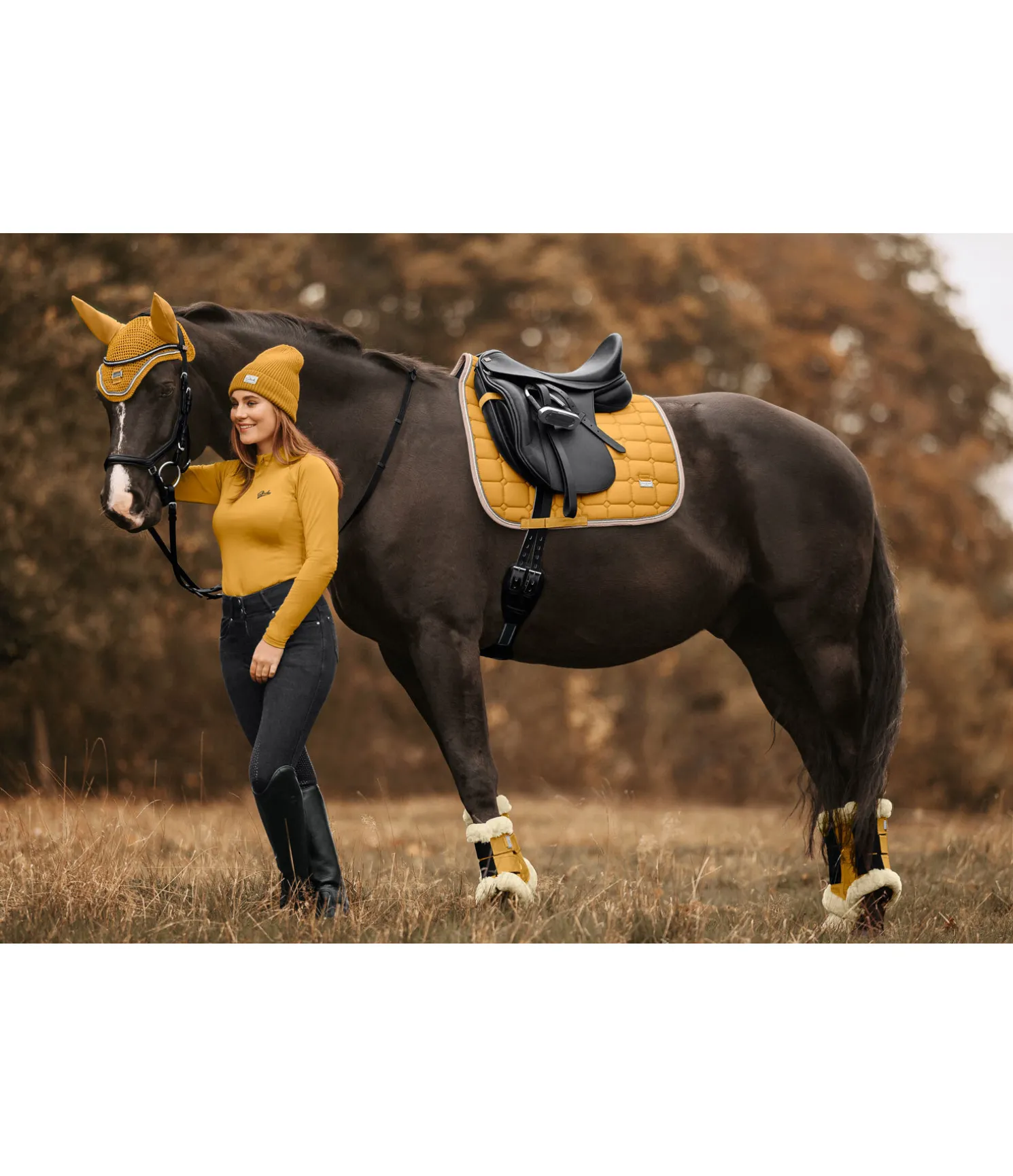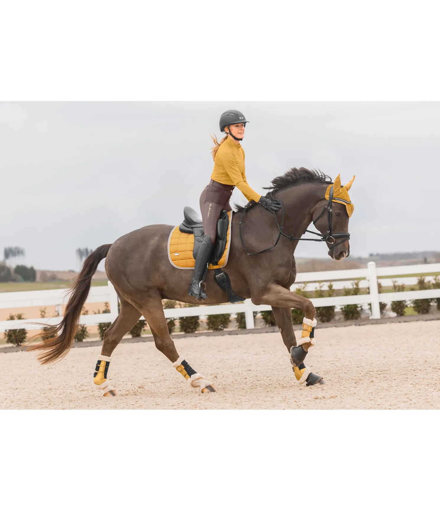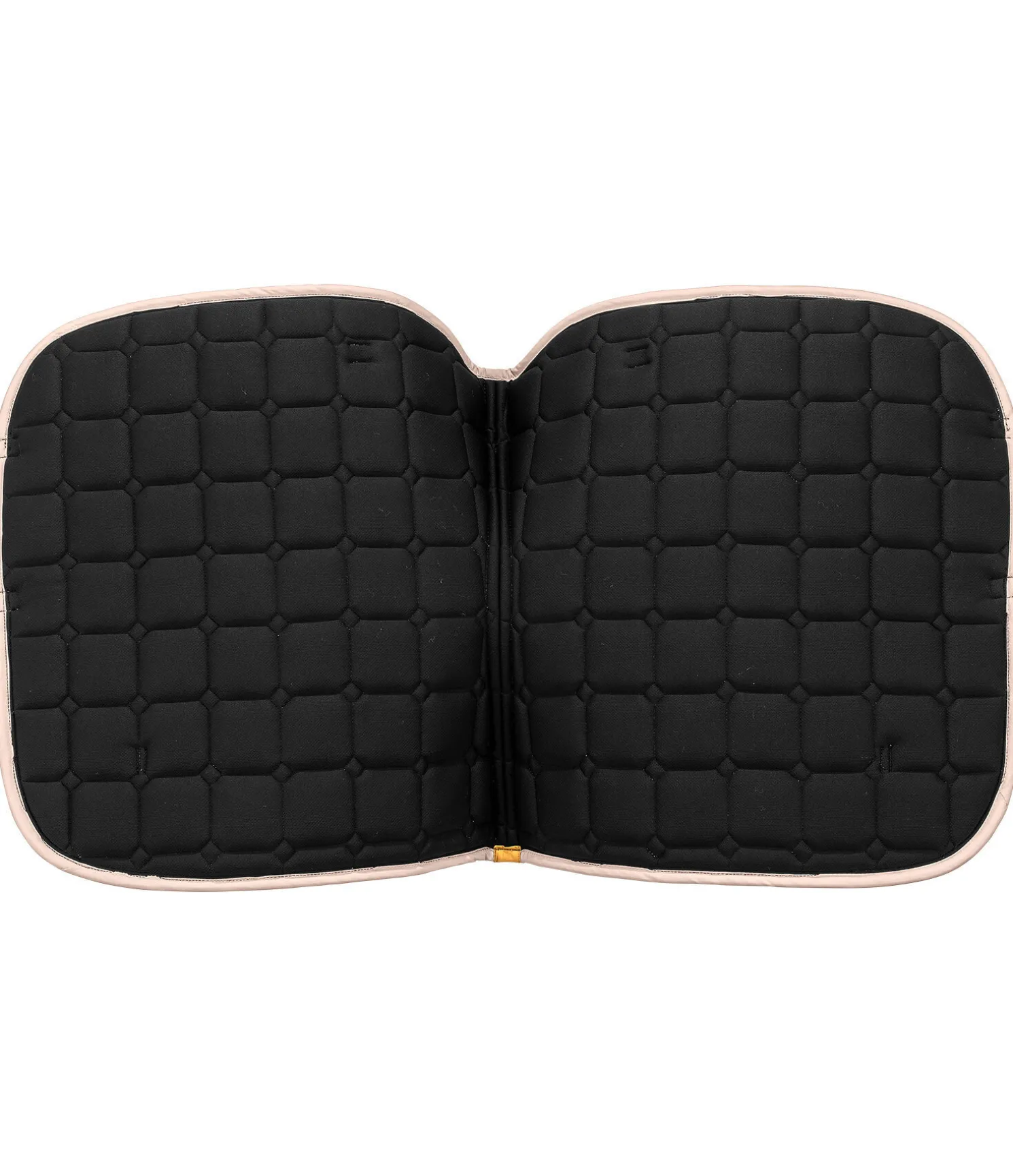 Tapis de selle élégant en tissu satiné et brillant avec grip en silicone dans la zone de la selle pour un maintien idéal. Détails élégants comme le double cordon décoratif et une plaque métallique de couleur assortie avec logo de chaque côté. Passants de sangle et de contre-sanglons avec patte auto-agrippante pratique. Doublure en mesh respirant et absorbant l’humidité. 100 % polyester.