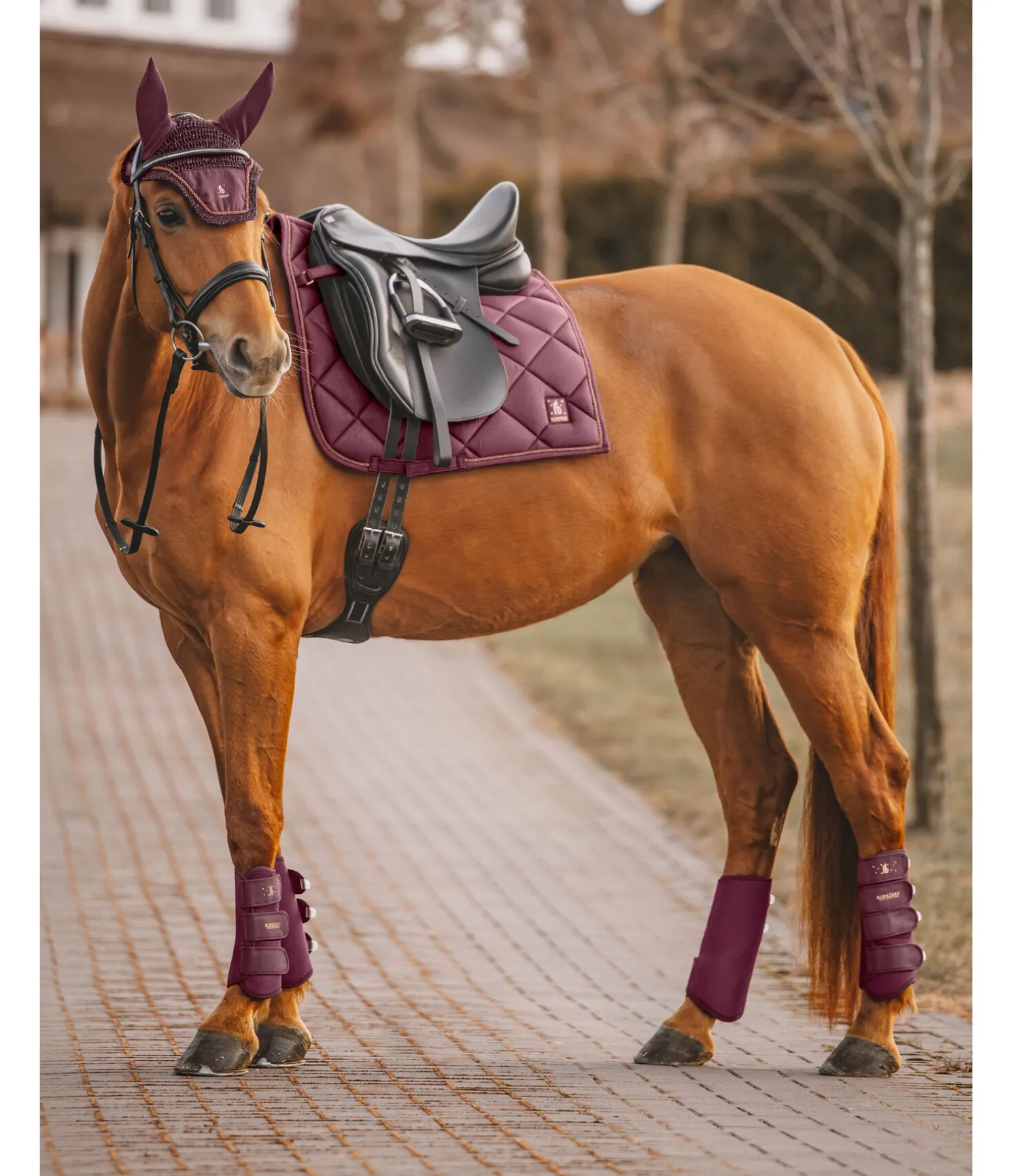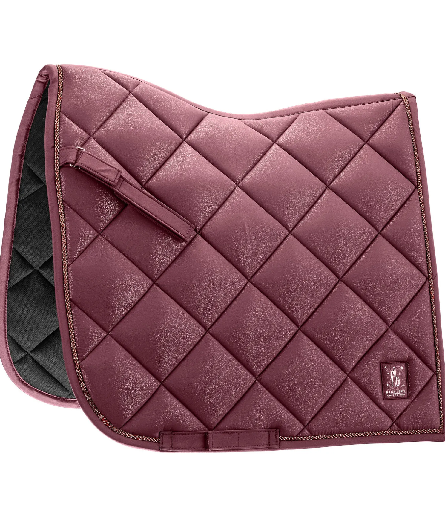 Élégant tapis de selle de forme carrée avec un soupçon de paillettes sur toute la matière supérieure et cordon décoratif scintillant. Logo de couleur assortie. Passants de contre-sanglons amovibles et passants de sangle avec pattes auto-agrippantes pratiques. Dessous en Air mesh respirant et absorbant l’humidité.