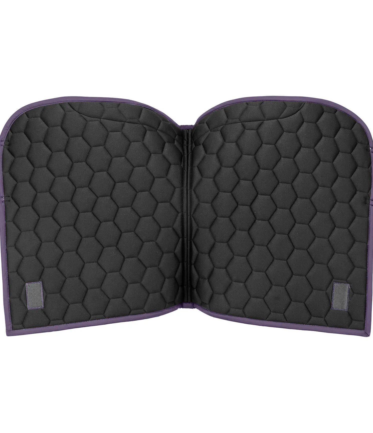 Tapis de selle avec rembourrage à l’avant permettant de garder la selle en place sans passants de contre-sanglons. Coupe sportive avec angle droit et surpiqûre en losanges. Dessus en matière lisse anti-salissures, cordon décoratif de couleur assortie et plaque logo métallique classique. Passants de sangle avec patte auto-agrippante pratique. Dessous en Air mesh respirant et absorbant l’humidité. 100 % polyester.