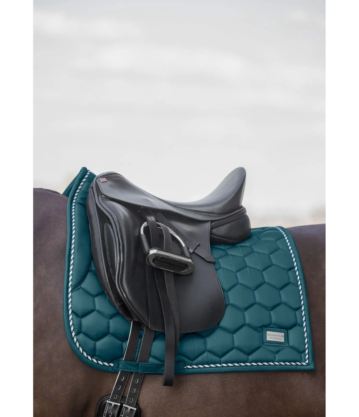 Tapis de selle avec rembourrage à l’avant permettant de garder la selle en place sans passants de contre-sanglons. Coupe sportive avec angle droit et surpiqûre en losanges. Dessus en matière lisse anti-salissures, cordon décoratif de couleur assortie et plaque logo métallique classique. Passants de sangle avec patte auto-agrippante pratique. Dessous en Air mesh respirant et absorbant l’humidité. 100 % polyester.