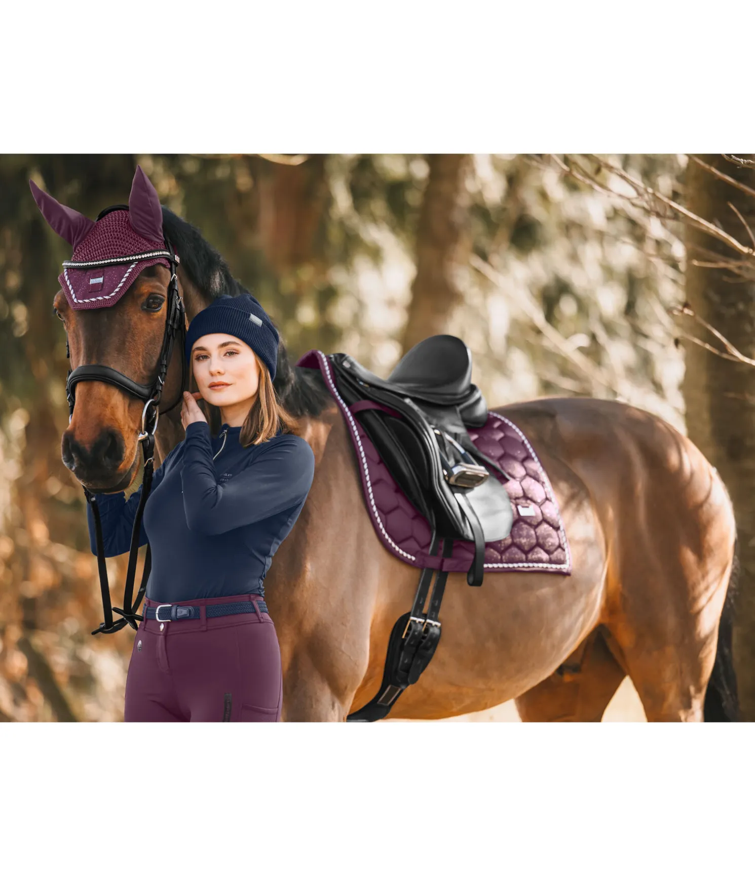Tapis de selle de forme carrée. Satiné et orné de fragments scintillants, d’un triple cordon décoratif et d’une petite plaque métallique avec logo gravé. Plaque argentée en S, dorée en CO et rose-doré en NV. Passants de sangle et de contre-sanglons avec patte auto-agrippante pratique. Dessous en Air mesh respirant et absorbant l’humidité. 100 % polyester.