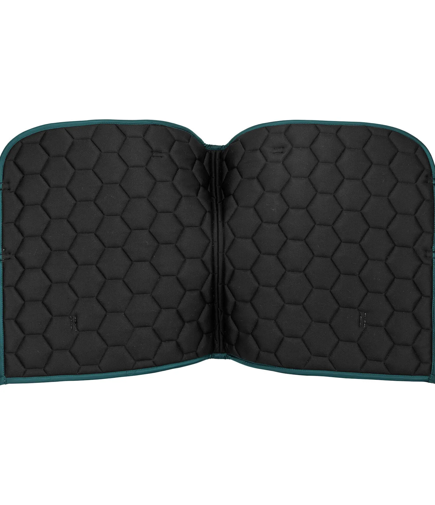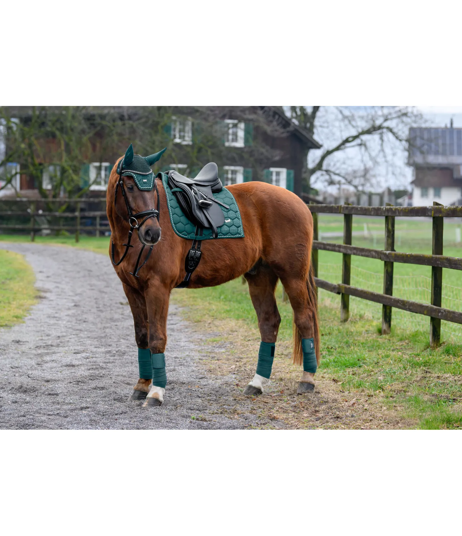 Tapis de selle de forme carrée. Satiné et orné de fragments scintillants, d’un triple cordon décoratif et d’une petite plaque métallique avec logo gravé. Plaque argentée en S, dorée en CO et rose-doré en NV. Passants de sangle et de contre-sanglons avec patte auto-agrippante pratique. Dessous en Air mesh respirant et absorbant l’humidité. 100 % polyester.