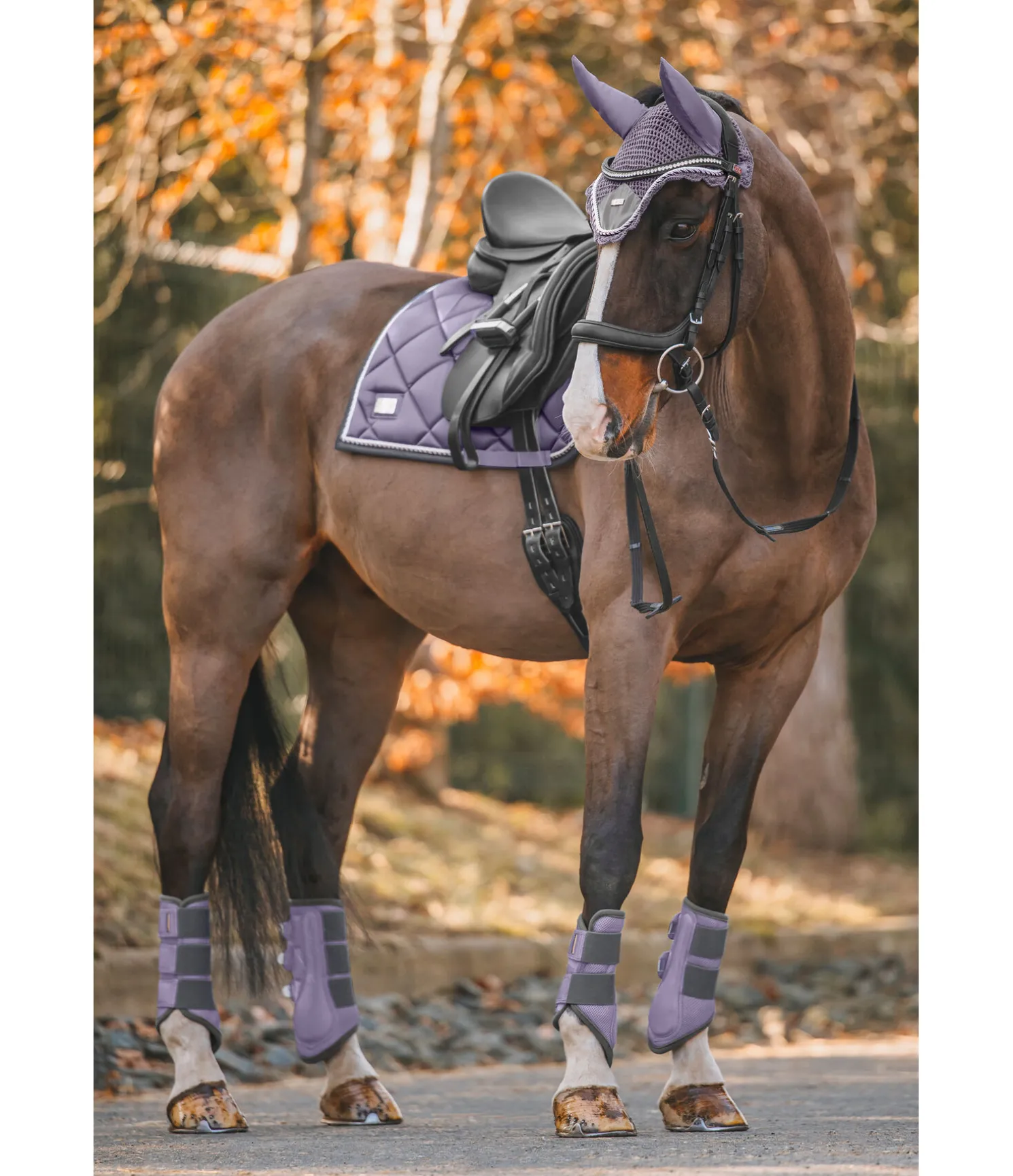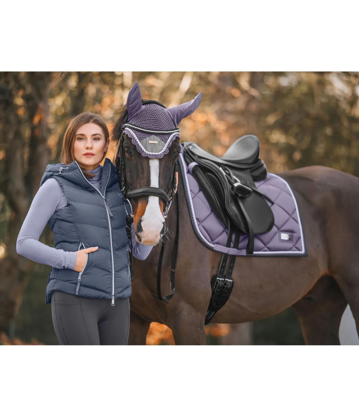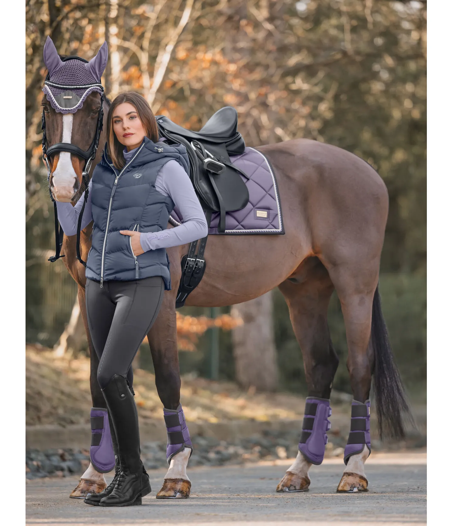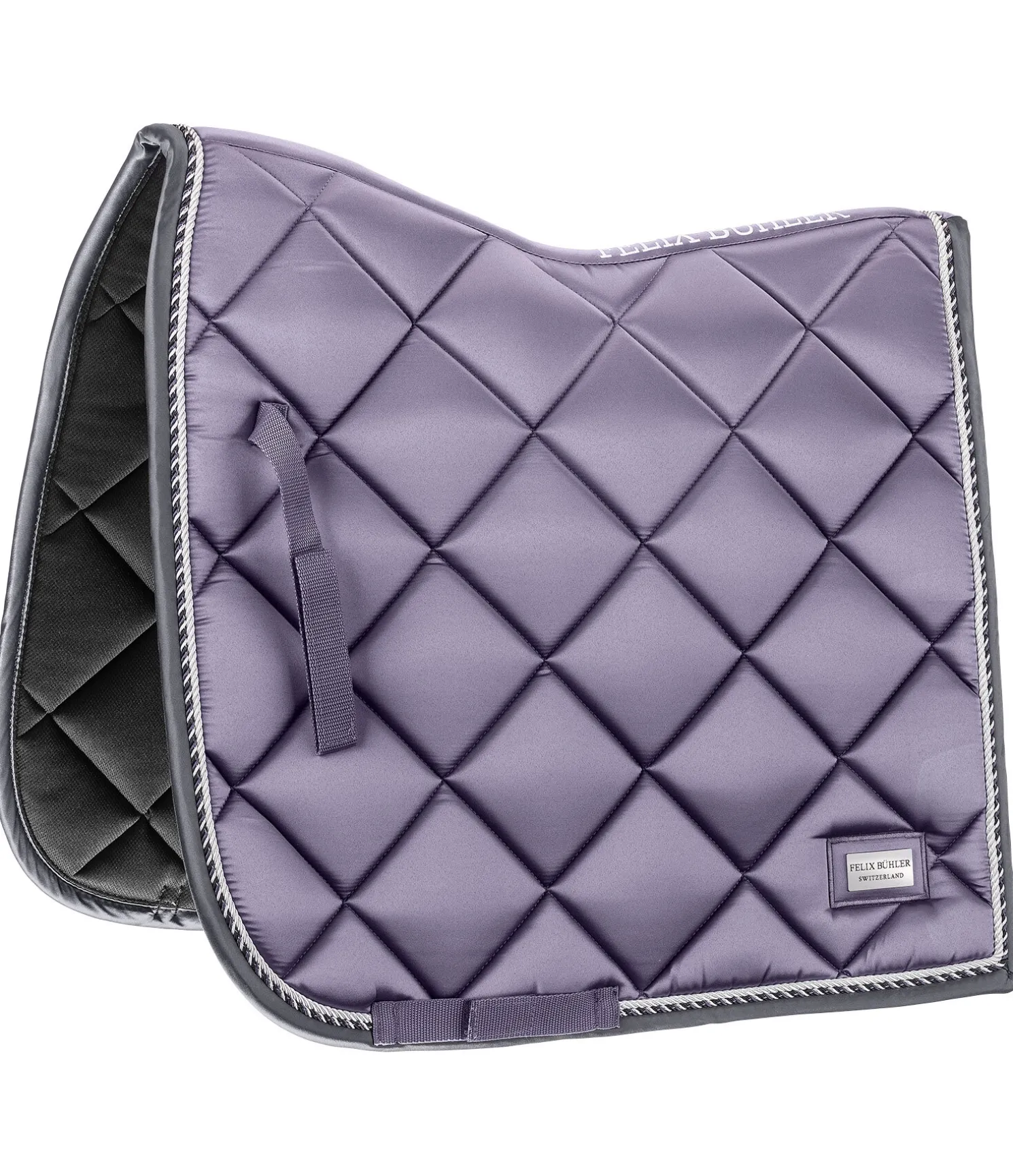 Tapis de selle de forme carrée. Petite plaque argentée avec logo. Tissu satiné. Cordons décoratifs de couleur assortie. Passants de sangle et de contre-sanglons avec patte auto-agrippante pratique. Dessous en Air mesh respirant et absorbant l’humidité. 100 % polyester.