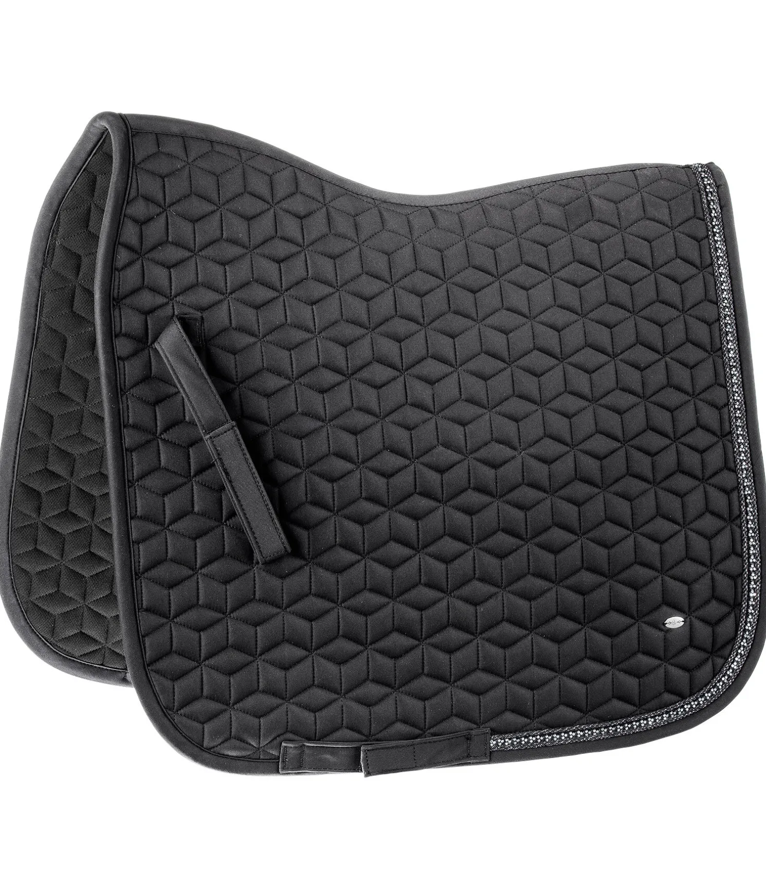 Tapis scintillant orné de petits strass sur un double cordon décoratif brillant. Plaque logo discrète et petite surpiqûre. Passants de sangle et de contre-sanglons avec pattes auto-agrippantes pratiques. Dessous en matière Air mesh respirante et absorbant l’humidité. 100 % polyester.