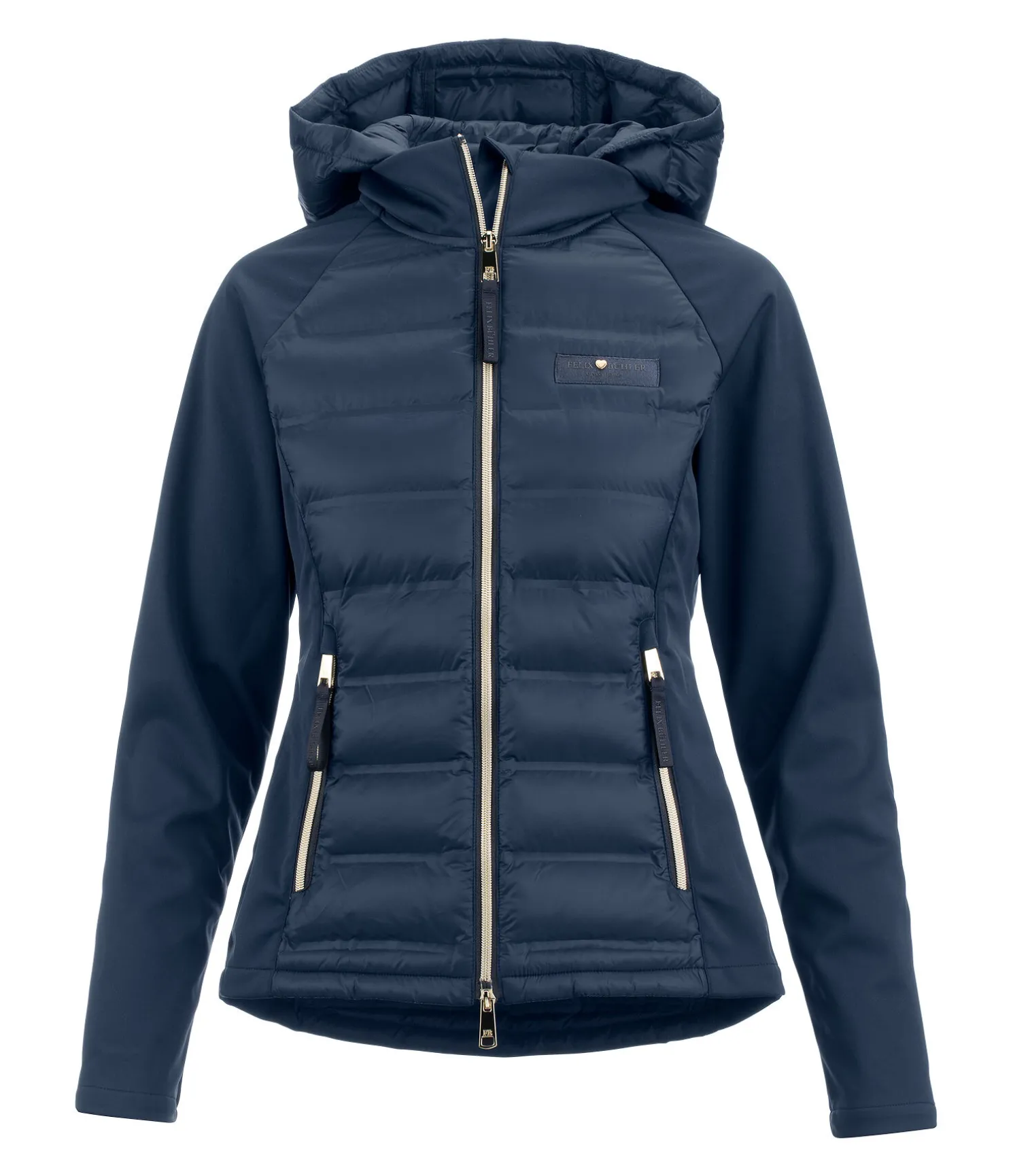 Veste d’équitation bi-matière technique. Matelassage doux avec coutures thermosoudées et garnissage léger en imitation duvet. Côtés et manches raglan en softshell extensible. Col montant avec capuche matelassée amovible grâce à une fermeture à glissière. Bouton-pression pour fixer la capuche dans le dos. Fermeture à glissière double sens avec sous-patte et protège-menton. Deux poches latérales zippées. Badge du logo sur la poitrine. 100 % nylon. Softshell et garnissage en imitation duvet 100 % polyester.