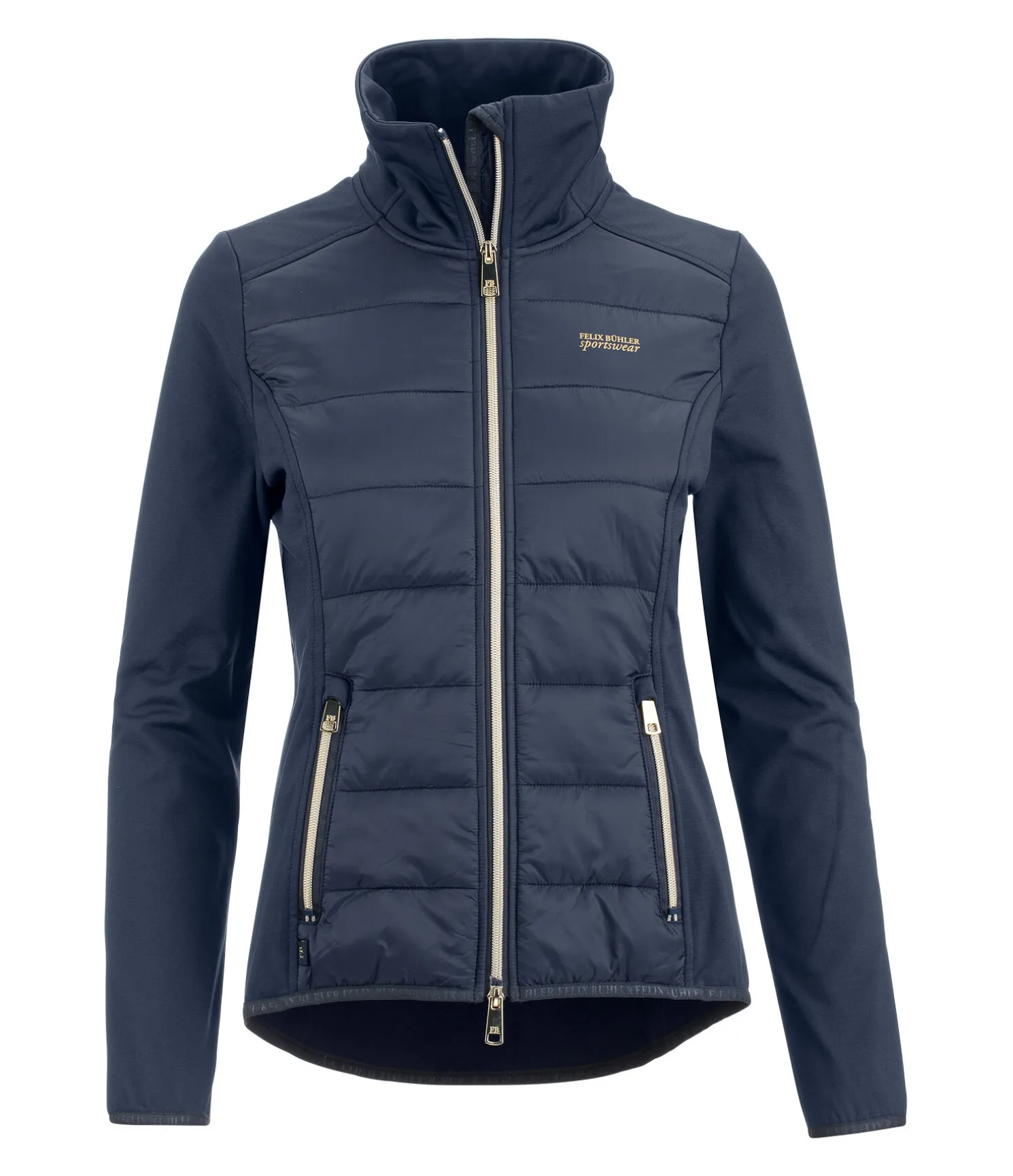 Alliance sportswear entre le nylon résistant légèrement matelassé à l’avant et le tissu stretch Performance très extensible. Le stretch est très respirant, permet un ajustement parfait et une liberté de mouvement optimale en selle. Col montant, fermeture à glissière double sens avec sous-patte et protège-menton. Deux poches latérales zippées. Poignets et taille élastiqués avec signature Felix Bühler. Face avant 100 % nylon ; stretch Performance 90 % polyester, 10 % élasthanne.