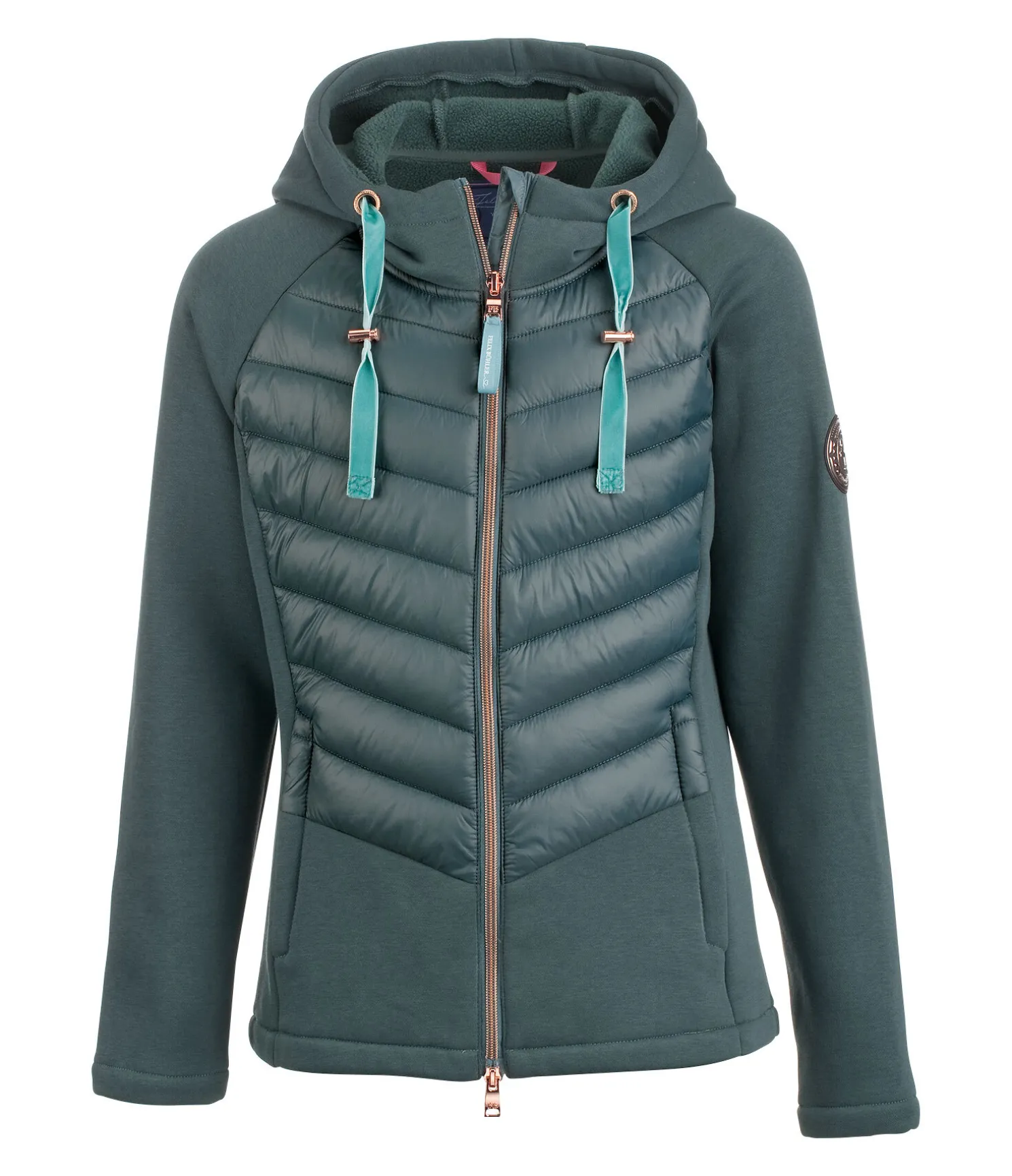 Veste d’équitation bi-matière. Coton mélangé stretch respirant, déperlant et coupe-vent au niveau des manches, du dos et sur les côtés. Nylon matelassé rembourré à l’avant. Intérieur molletonné. Col montant. Capuche ajustable. Bouton-pression pour fixer la capuche dans le dos. Imprimé Felix Bühler sur la manche. Deux poches latérales zippées. Fermeture à glissière à double sens rose doré avec sous-patte et protège-menton. Bas des manches et taille élastiqués. Extérieur 64 % polyester, 36 % coton. Insert matelassé 100 % nylon.