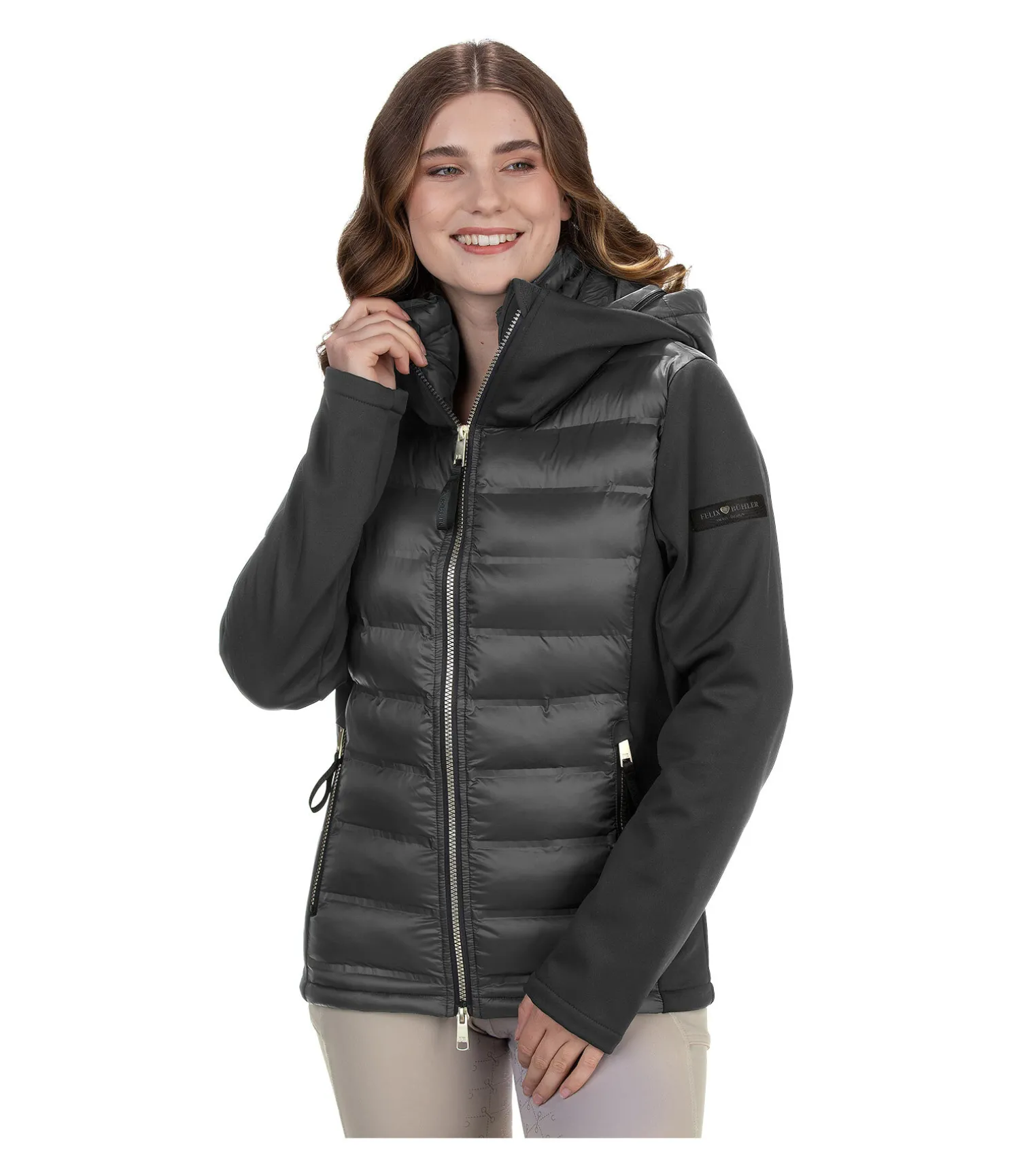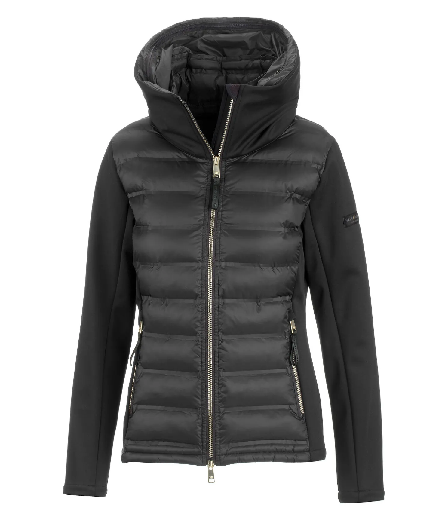 Superbe combinaison de softshell extensible et de nylon avec un garnissage très doux en imitation duvet devant et derrière. Coupe-vent. Double col et capuche rembourrée repliable dans le large col extérieur par fermeture à glissière. Coutures thermosoudées, fermeture à glissière double sens avec sous-patte et protège-menton, 2 poches zippées devant. Logo élaboré sur la manche et le col. Avant, dos, col intérieur et capuche 100 % nylon, matière softshell 92 % polyester, 8 % élasthanne.