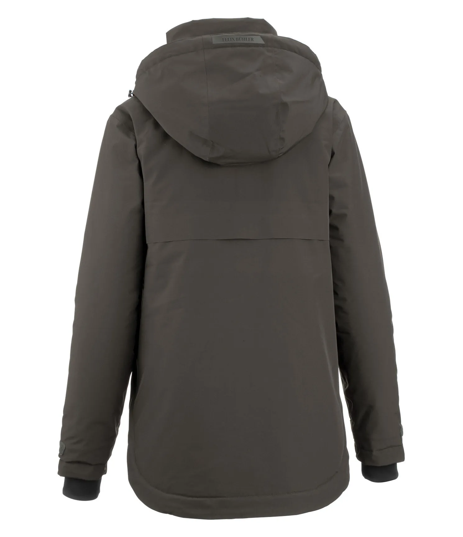 Veste d’équitation avec doublure chaude. Matière respirante, imperméable (10.000 mm) et coupe-vent. Col montant. Capuche amovible et réglable. Bouton-pression pour fixer la capuche dans le dos. Fermeture à glissière double sens étanche avec sous-patte. 2 poches avant zippées et dissimulées. 1 poche intérieure zippée. Bas des manches ajustable, élastiqué et coupe-vent. Bouton-pression sur chaque côté. Coupe plus longue à l’arrière. Imprimé Felix Bühler sur les manches, la capuche et les poignets. 100 % polyester.