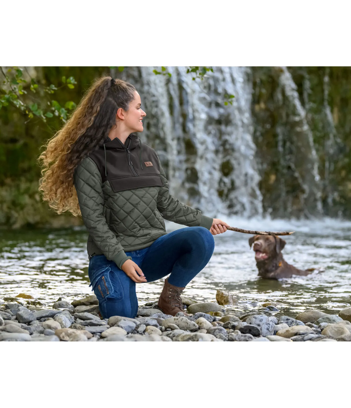 Veste matelassée avec capuche, à enfiler. Fonctionnelle et déperlante. Col montant zippé. Doublure en sherpa douce. Matelassage léger. Deux poches latérales zippées. Une grande poche à rabat avec patte auto-agrippante pour garder ses effets personnels en toute sécurité. Insert en softshell coupe-vent au niveau de la poitrine, des épaules et de la capuche. Ourlet élastiqué pour un ajustement parfait. Cette veste est idéale pour la mi-saison. Extérieur 100 % polyester ; softshell 94 % polyester, 6 % élasthanne ; doublure 100 % coton ; matelassage 100 % polyester.