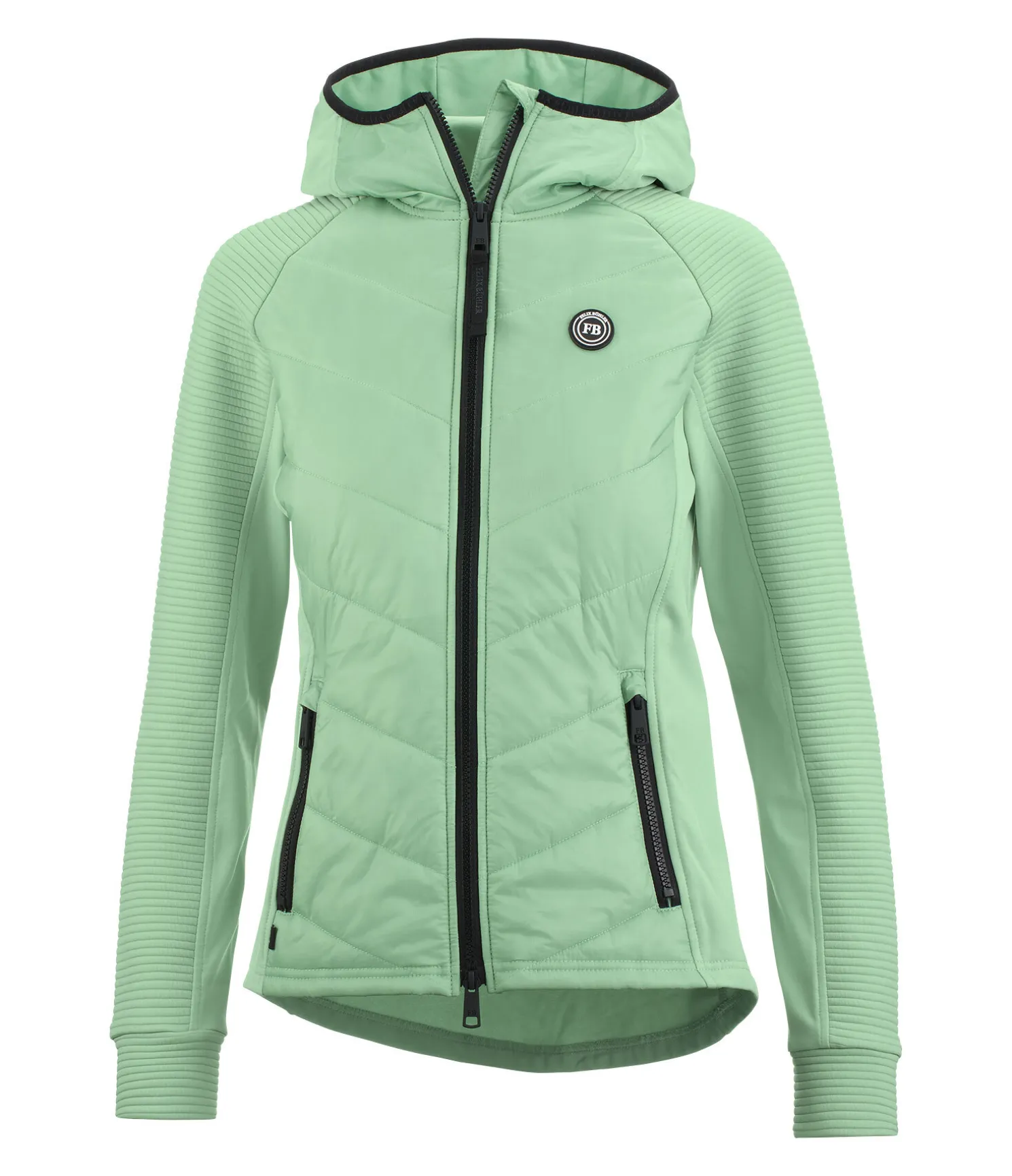 Alliance parfaite entre le nylon résistant légèrement matelassé à l’avant et le tissu stretch Performance très extensible dans le dos et sur les manches et les côtés. Manches raglan avec empiècements extensibles texturés. Fermeture à glissière double sens avec sous-patte et protège-menton. Deux poches latérales zippées. Badge Felix Bühler sur la poitrine. Capuche avec bord élastiqué et empiècements texturés. Devant 100 % nylon ; stretch Performance 90 % polyester, 10 % élasthanne.