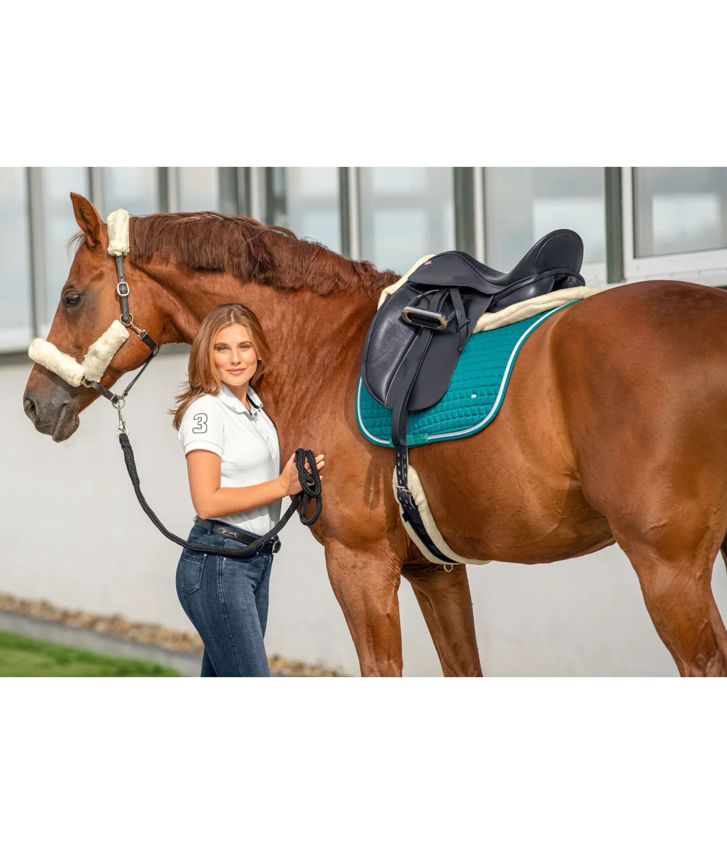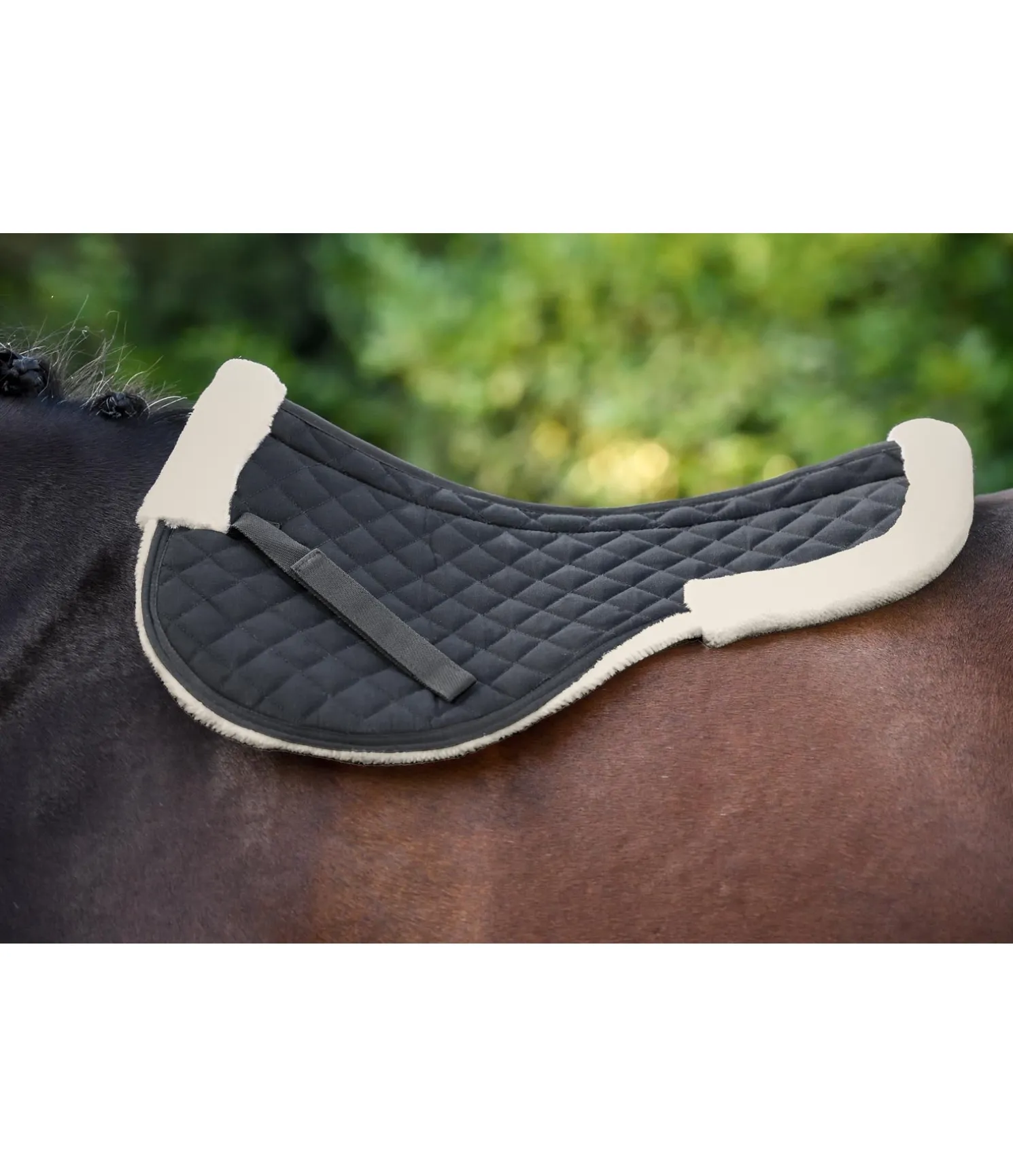 Amortisseur moelleux pour protéger le dos sensible du cheval. Dessus 65 % polyester, 35 % coton, garnissage et polaire Teddy 100 % polyester. Longueur de dos 62 cm, hauteur 20 à 28 cm
