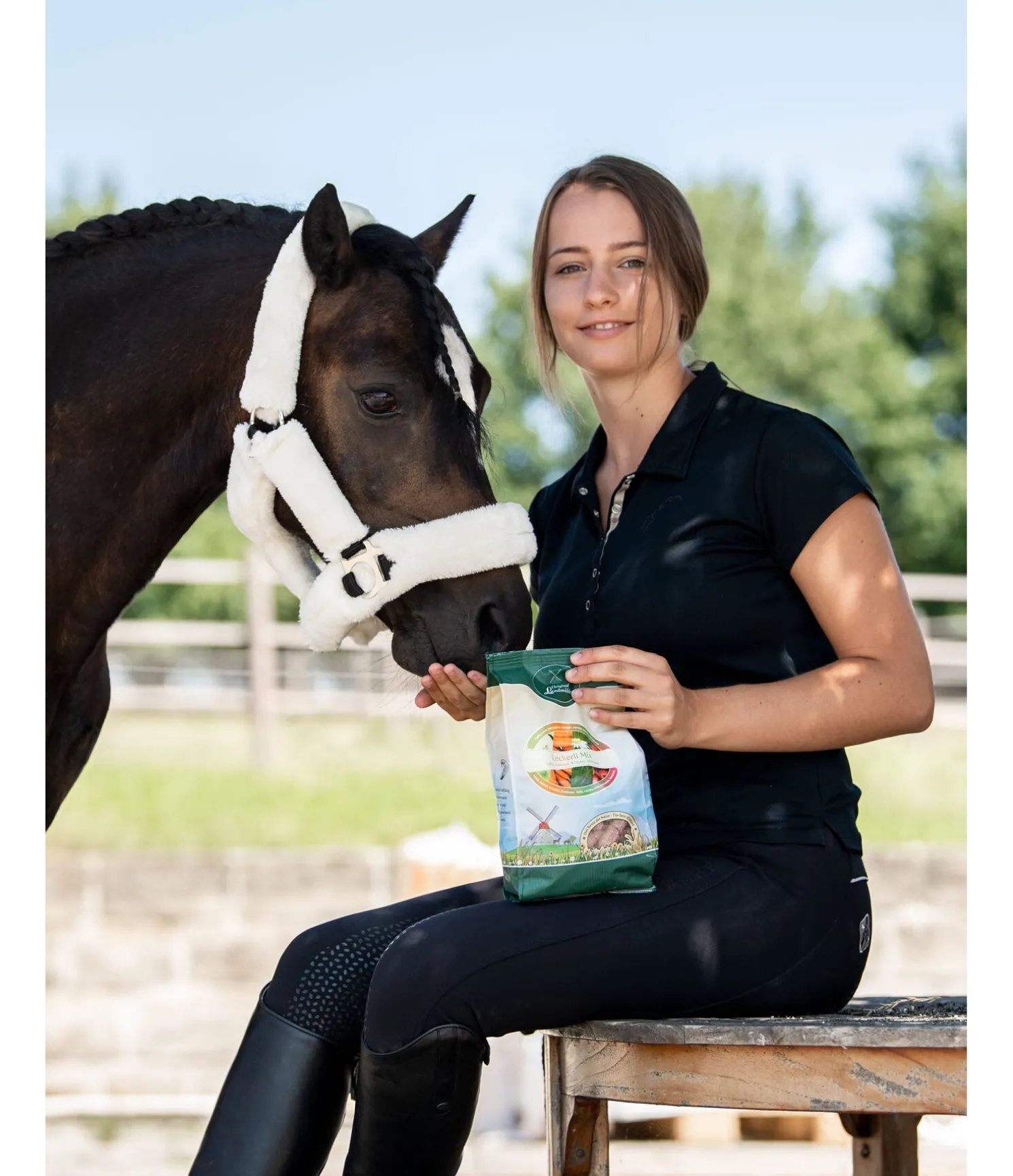 Composition : son de blé, son d’avoine, carbonate de calcium, farine de luzerne verte, mélasse de canne à sucre, orge, maïs, 0,1 % pomme (séchée).