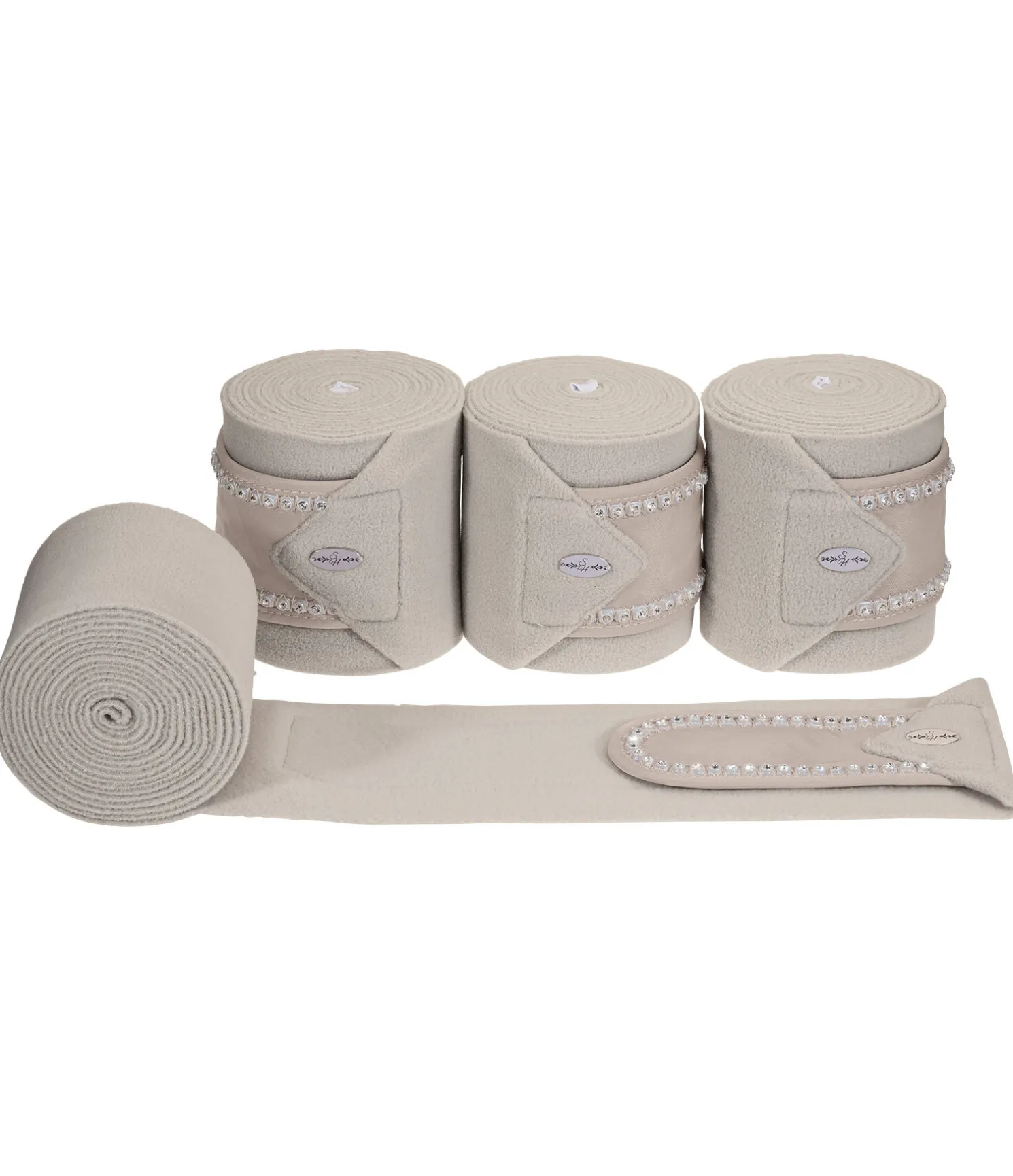 Bandes de polo en polaire. Passepoil avec strass sur la fermeture des bandes. Patte auto-agrippante pour un maintien sûr. 100 % polyester. F (cheval) : 300 x 10 cm, P (poney) : 200 x 8 cm. Vendues par lot de 4.