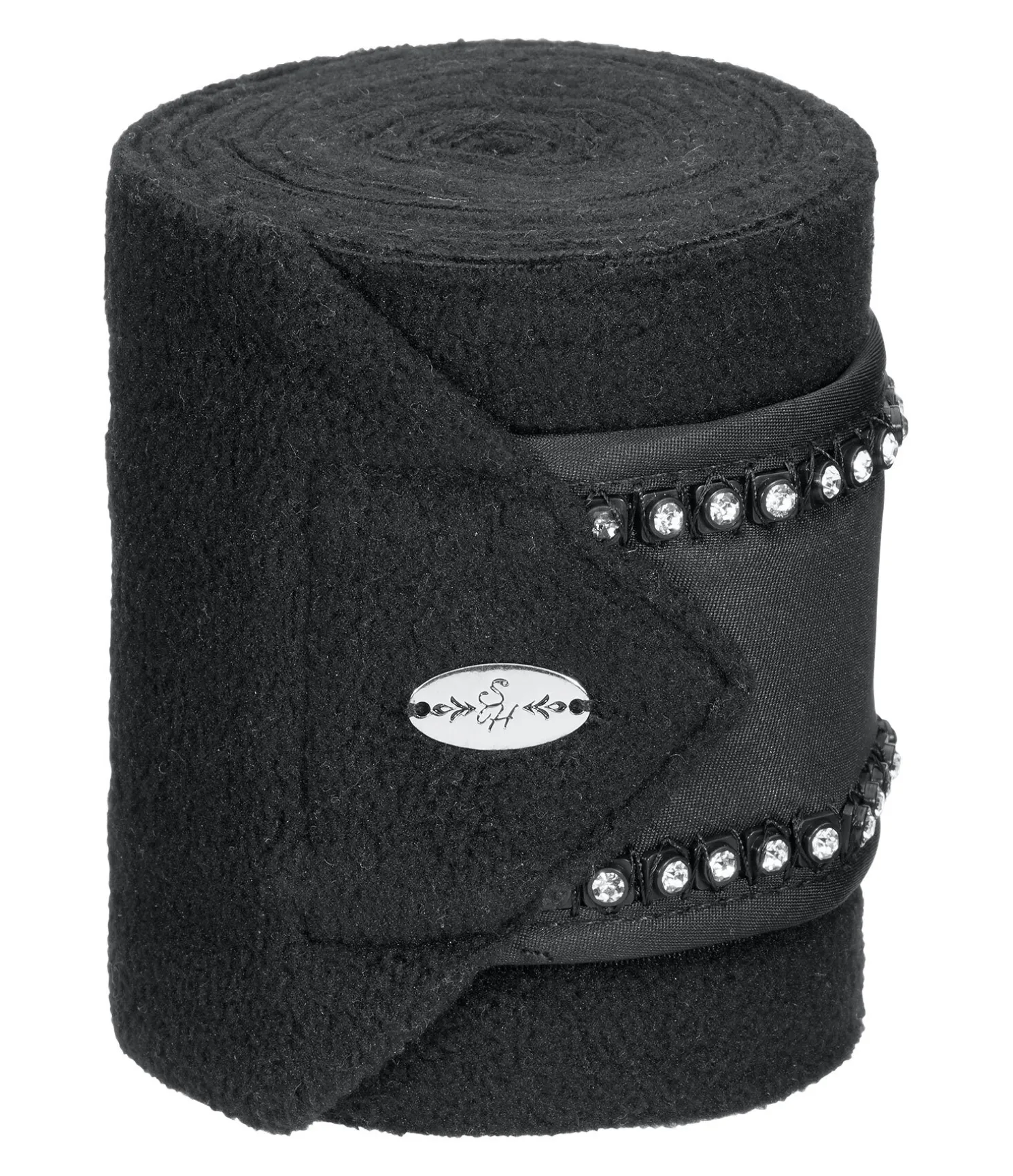 Bandes de polo en polaire. Passepoil avec strass sur la fermeture des bandes. Patte auto-agrippante pour un maintien sûr. 100 % polyester. F (cheval) : 300 x 10 cm, P (poney) : 200 x 8 cm. Vendues par lot de 4.