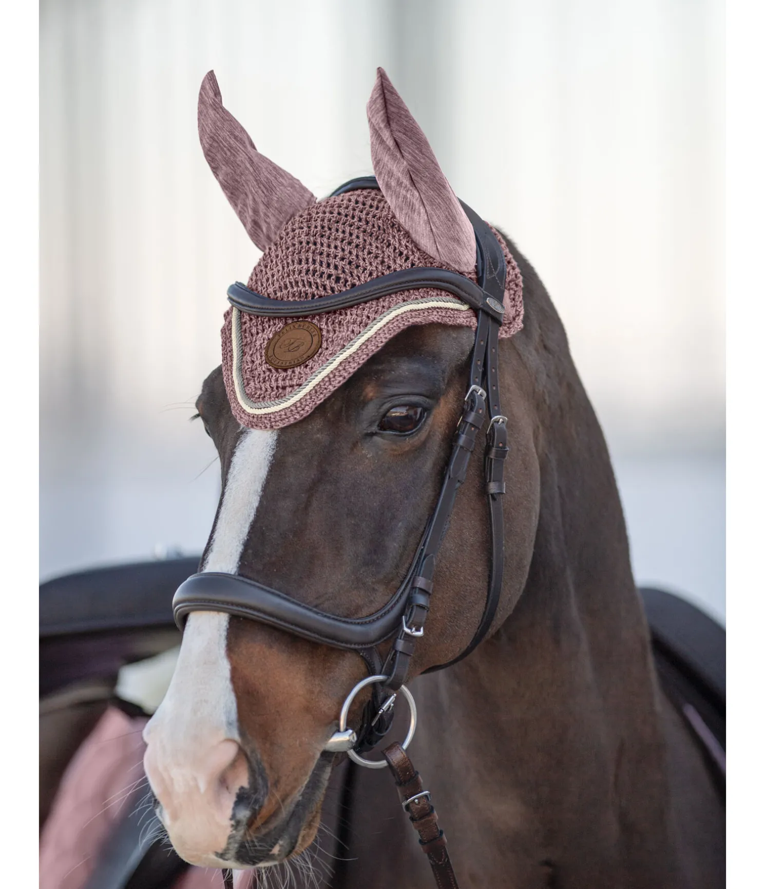 Bonnet anti-mouches classique en maille crochetée à l’aspect chiné, avec une matière extensible aux oreilles pour un confort optimal. Bordure ornée de deux élégants cordons décoratifs et logo en velours synthétique embossé. 100 % polyester.