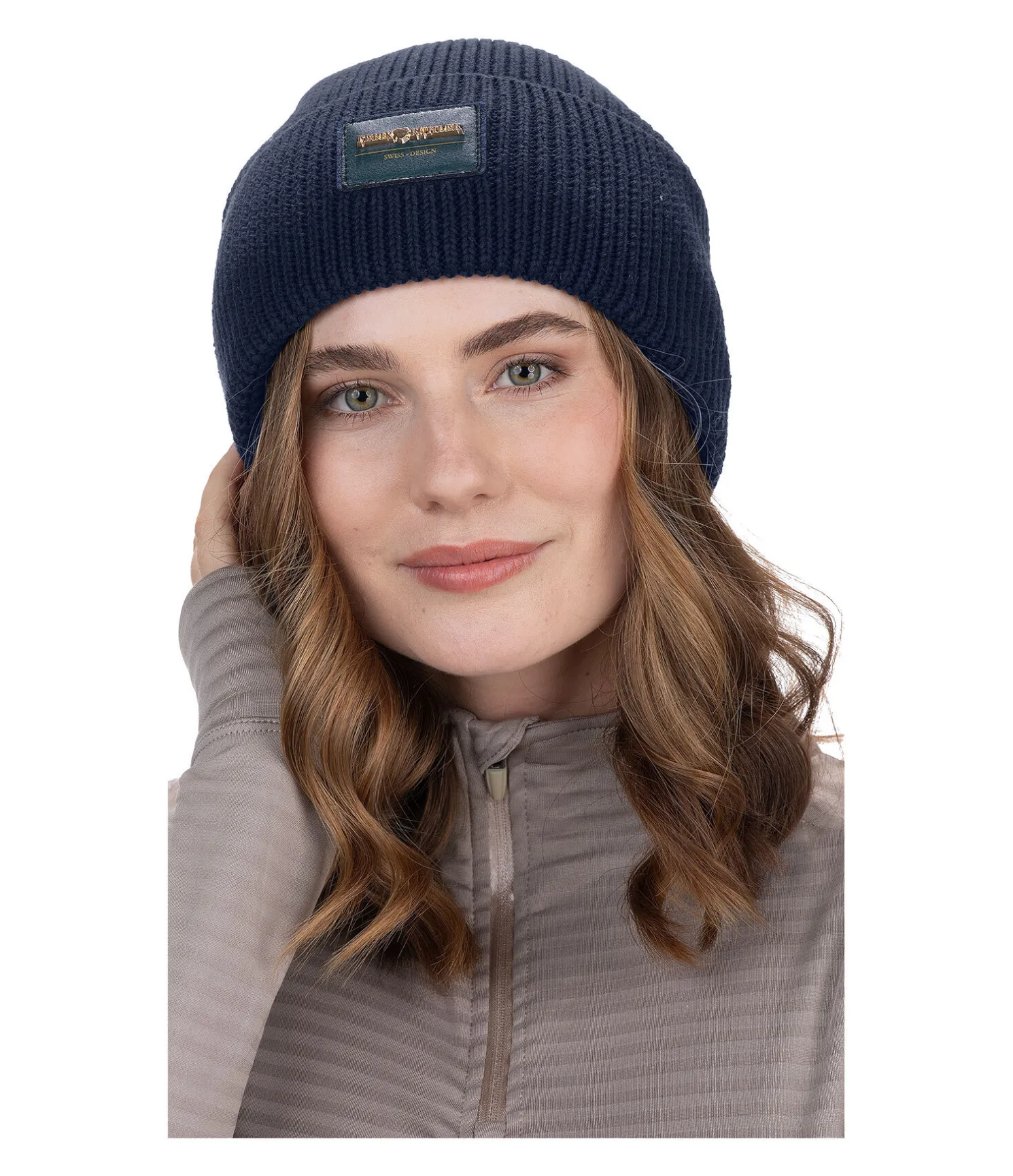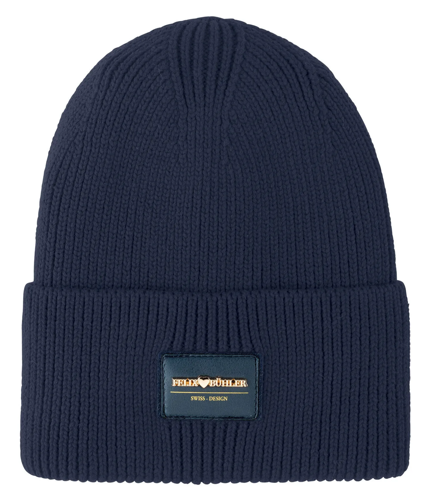 Bonnet chaud en maille côtelée tendance. Badge en relief avec logo doré. 100 % coton.