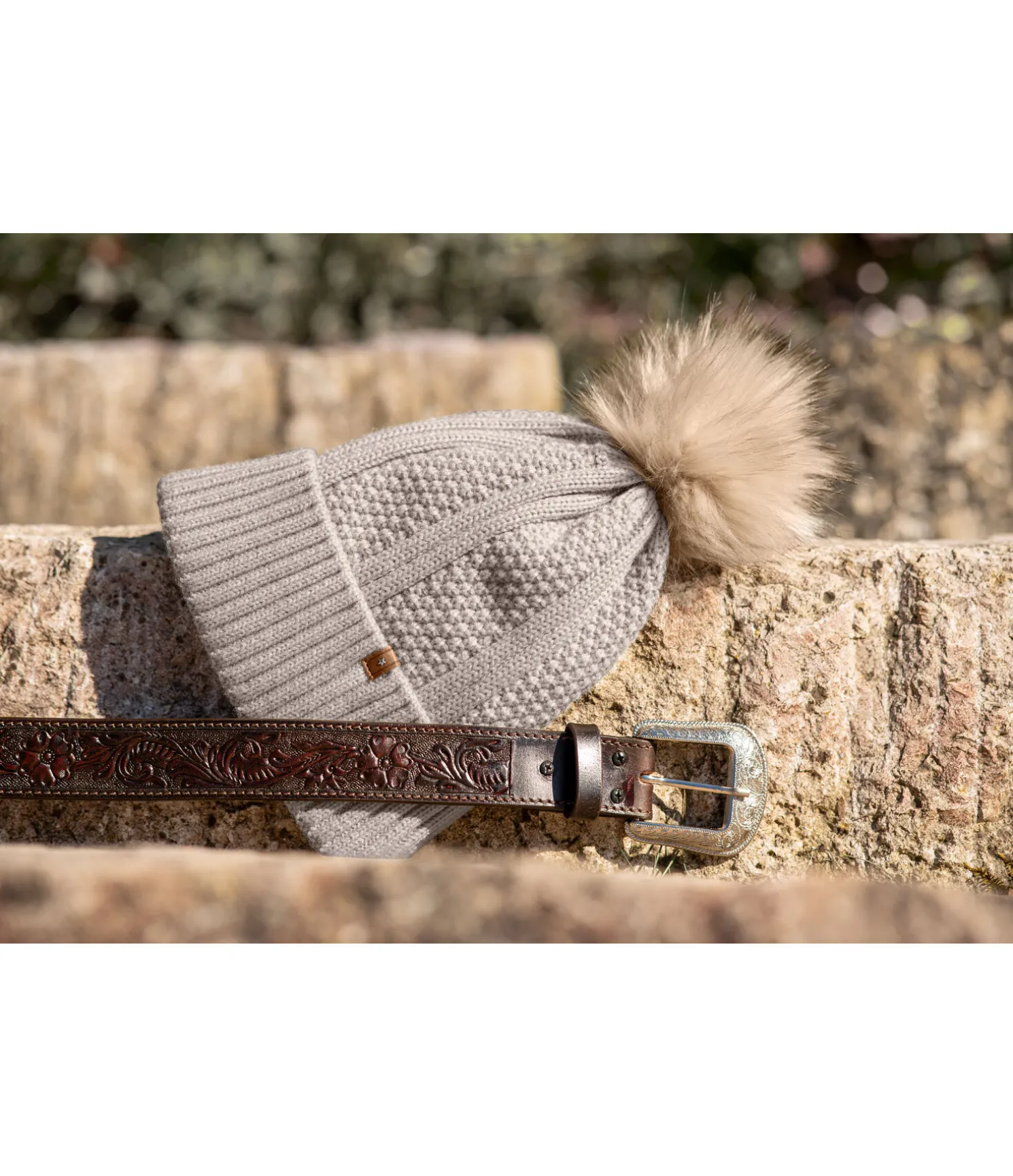 Bonnet à revers en maille avec pompon en fourrure synthétique. Doublure intérieure en polaire chaude. 100 % polyacrylique, doublure 100 % polyester.