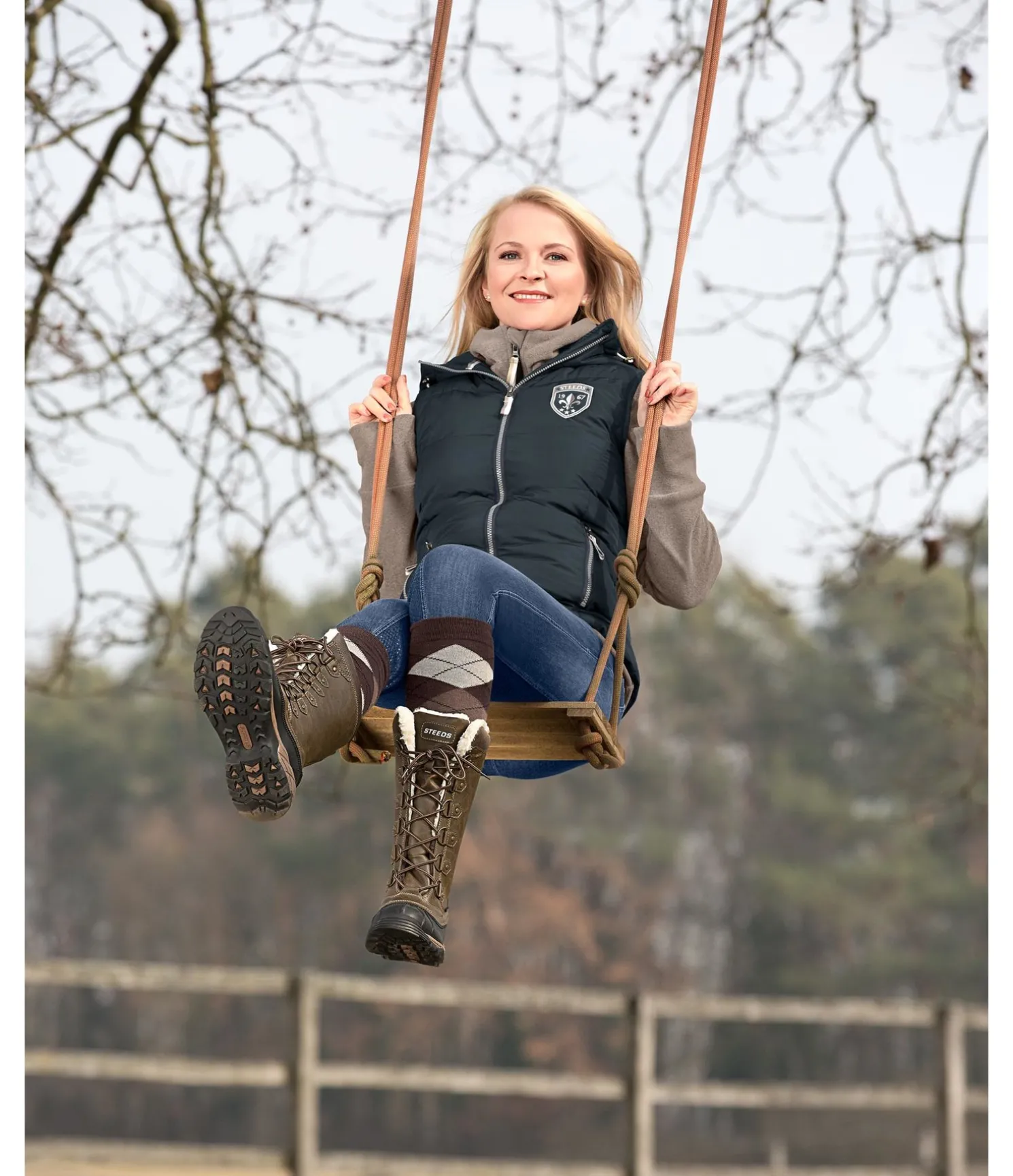 Bottes d’hiver mi-hautes et imperméables avec dessus résistant (PU) et semelle extérieure en caoutchouc. Entièrement doublées de polaire Teddy très douce (100% polyester) pour que les pieds restent bien au chaud même par de très froides températures. Zone du pied très confortable grâce à une semelle double couche avec une semelle intermédiaire en EVA. Le laçage intégral assure un ajustement optimal. Languette cousue sur le côté pour prévenir l’entrée de l’eau ou de la neige. Autres détails : rembourrage moelleux à la cheville, coutures contrastantes, semelle en caoutchouc cranté pour un bon appui.