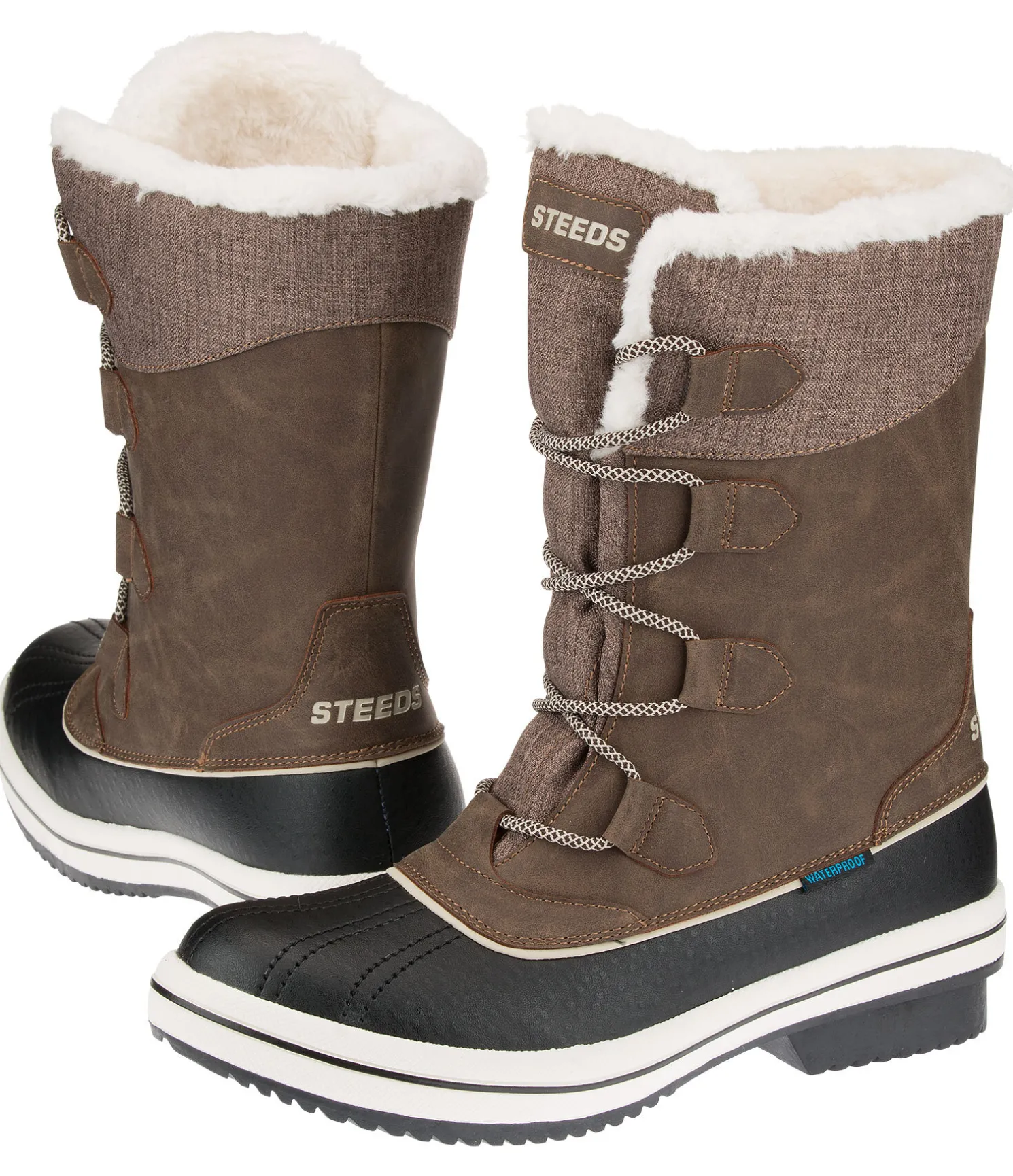 Bottes d’écurie imperméables. Idéales en cas de températures froides. Doublure épaisse en polaire. Revêtement imperméable et languette cousue sur le côté pour empêcher la neige ou l’eau de s’infiltrer. Semelle crantée adhérente, y compris sur des surfaces verglacées. Laçage à l’avant pour un ajustement optimal. Mélange de tissu et de matière PU pour un look unique.