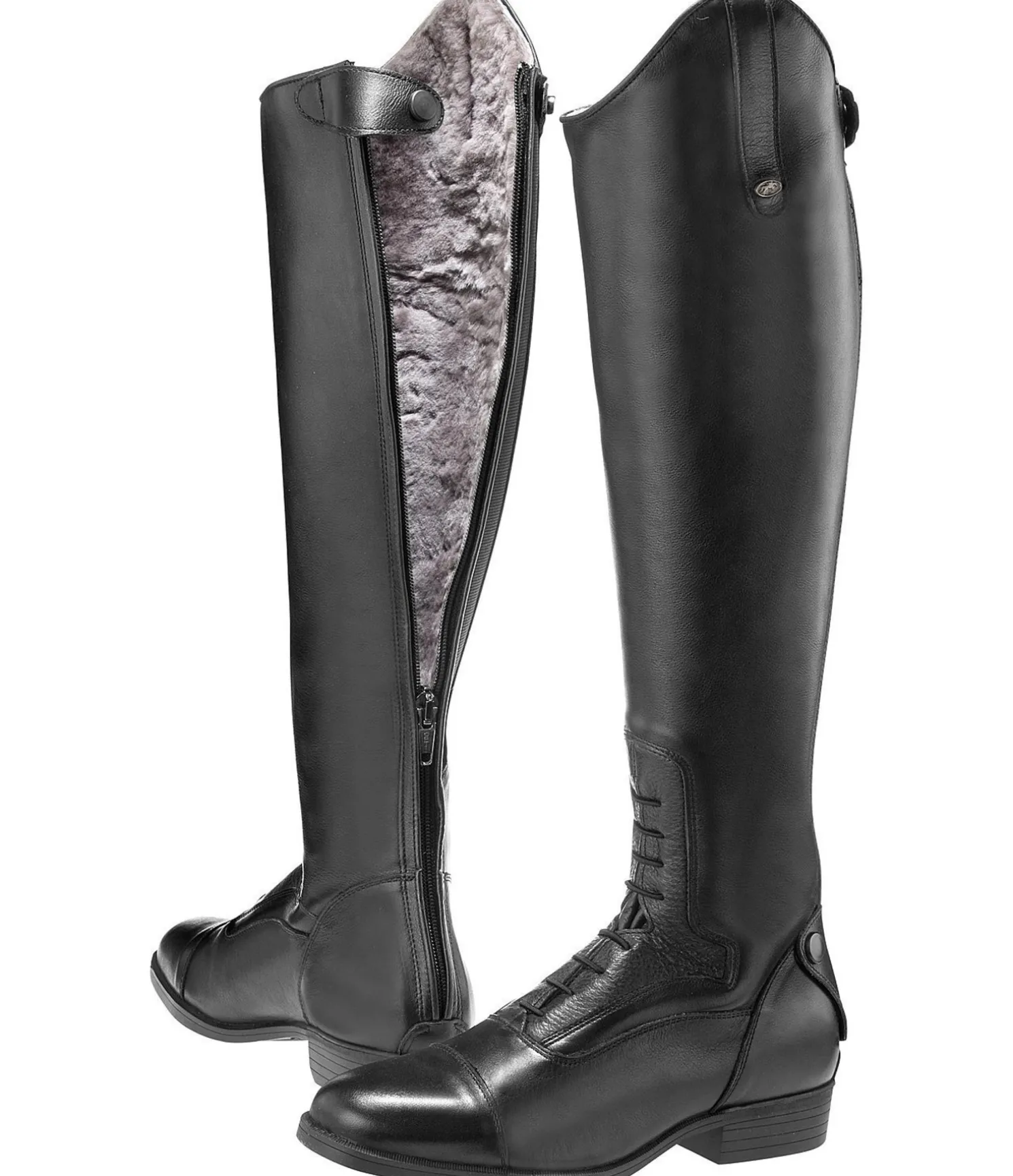 Bottes d’équitation d’hiver en cuir italien pleine fleur doublées de fourrure d’agneau véritable. Le cuir de grande qualité est à la fois agréablement doux et très résistant. Les bottes sont entièrement doublées de fourrure d’agneau véritable (pied et tige), ce qui garantit le maintien au chaud des pieds et des jambes tout en élégance. Semelle extérieure renforcée pour une meilleure protection contre le froid. Fermeture à glissière OPTI à l’arrière avec protection d’éperon et empiècement élastique sur un côté pour un ajustement parfait au niveau des mollets. Au niveau du laçage, empiècement en cuir grainé doux pour assurer la descente du talon dans l’étrier. Forme du pied fine en carré. Fabriquées au Portugal.