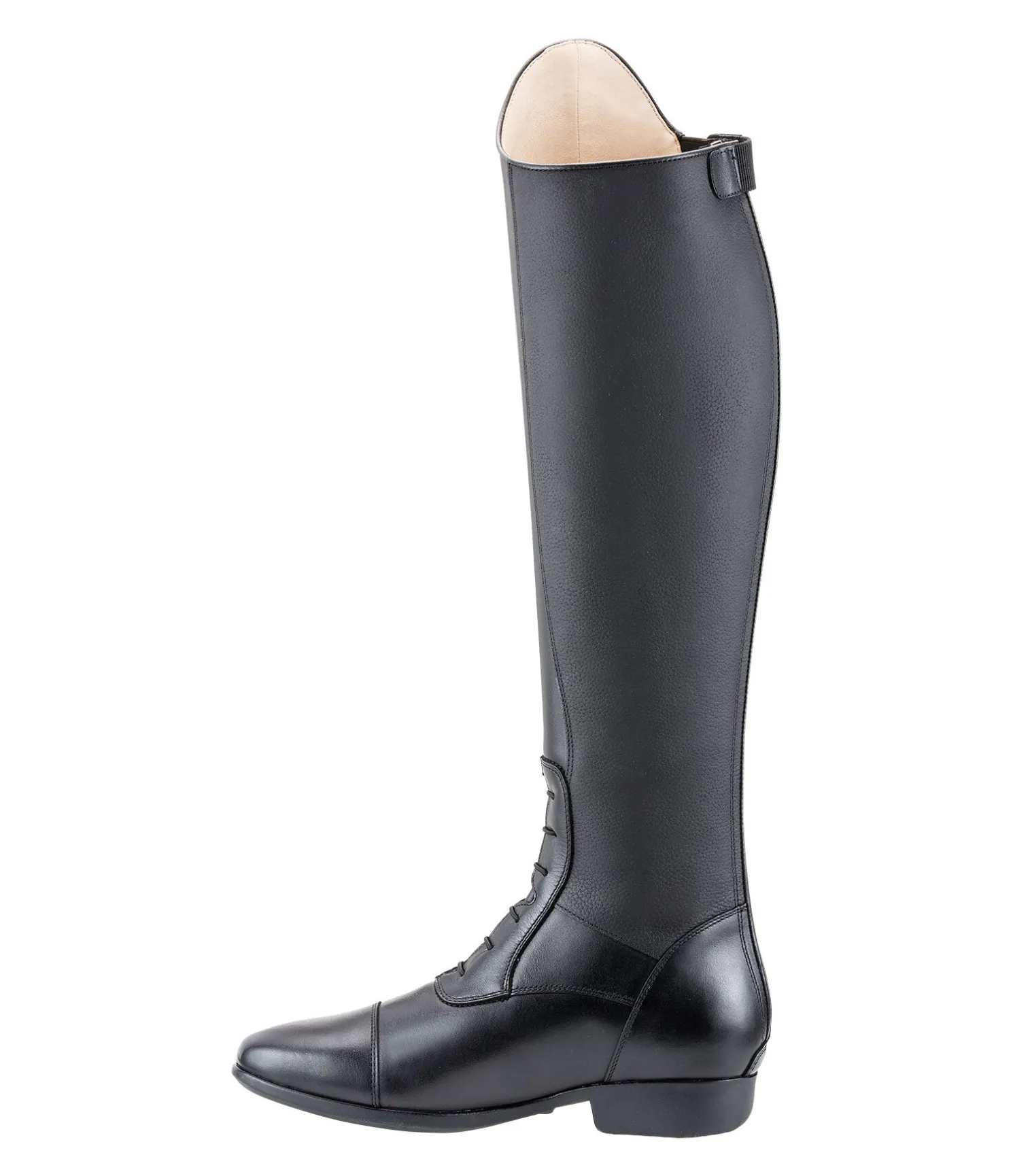 Bottes à lacets en cuir de vachette brésilien pleine fleur. Cuir grip grainé sur la face interne de la tige pour une meilleure adhérence à la selle. Fermeture à glissière OPTI de grande qualité à l’arrière pour faciliter l’enfilage, sécurisée par bouton-pression pour maintenir le zip fermé. Empiècement élastiqué sur le côté extérieur de la fermeture à glissière pour une adaptation optimale au mollet. Nouvelle semelle extérieure à bout carré afin d’offrir une tenue optimale dans l’étrier et apporter une touche d’élégance. Doublure intérieure souple en matière synthétique épousant parfaitement la jambe. Fabriquées au Portugal.