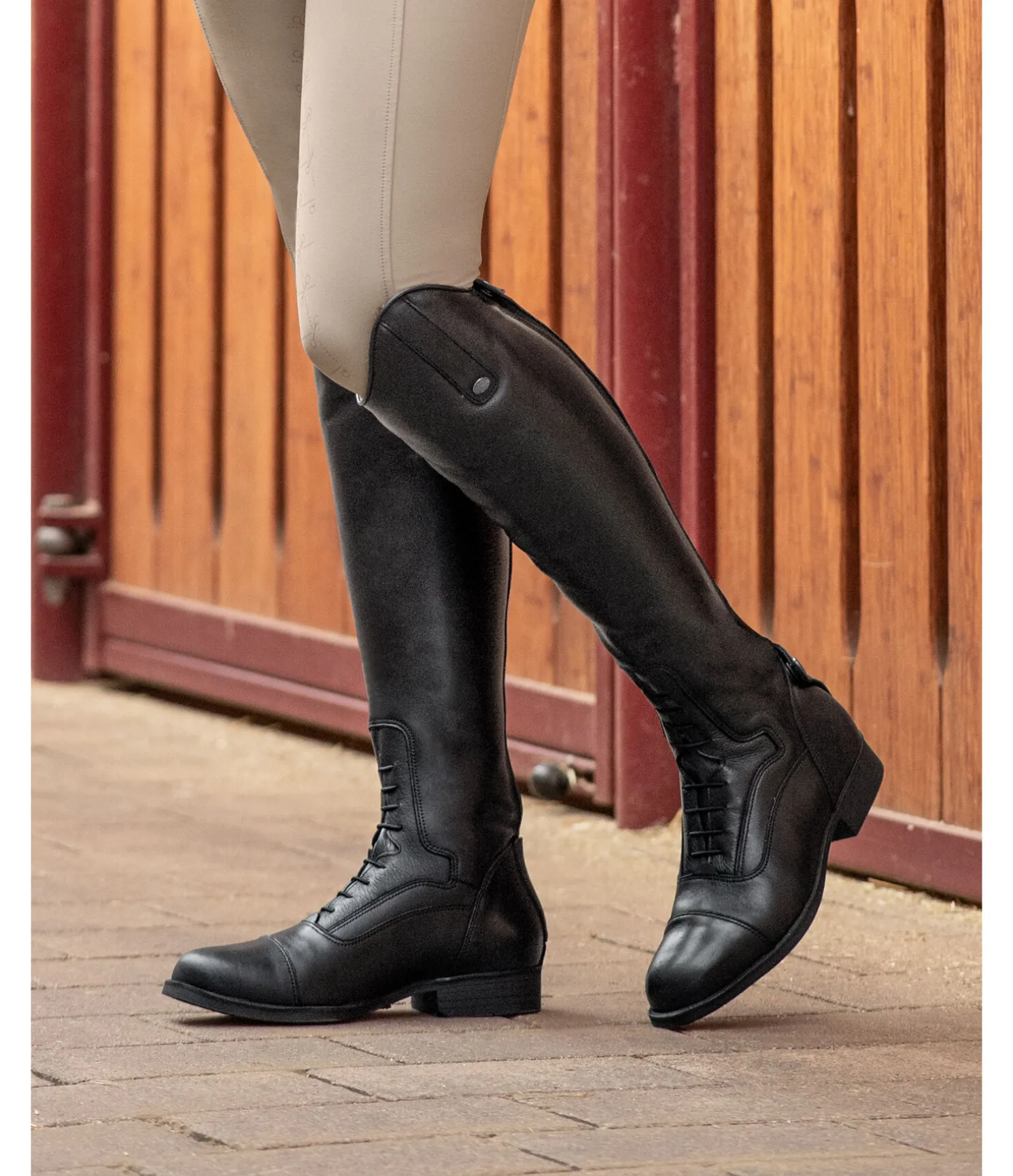 Bottes élégantes à lacets en cuir de vachette italien pleine fleur. Cuir souple et agréable bien que très robuste. Doublure en cuir de porc souple. Fermeture à glissière OPTI à l’arrière. Empiècement latéral élastiqué pour une adaptation parfaite au mollet. Empiècements en cuir pleine fleur souple autour des lacets et au niveau du talon pour permettre une position optimale du pied dans l’étrier. Forme carrée à bout fin. Autres détails : assise plantaire amortissante avec semelle intérieure amovible, semelle extérieure en caoutchouc, rabat au talon. Fabriquées au Portugal.
