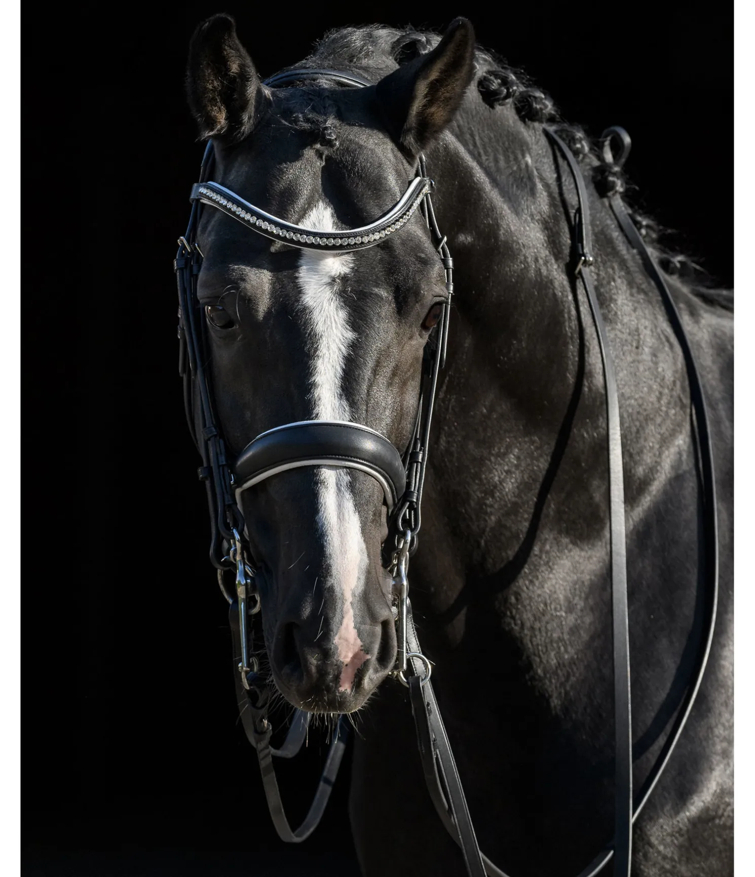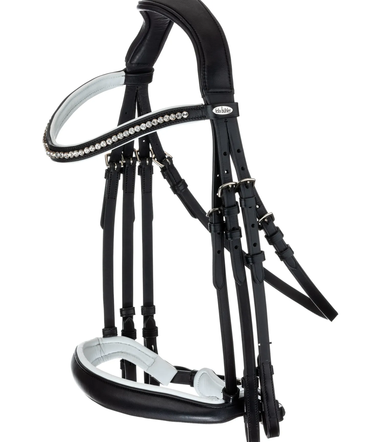 Bride en cuir gras Premium de grande qualité avec muserolle suédoise anatomique, dont la forme offre davantage de place au mors de bride. Têtière et muserolle en cuir particulièrement souple. Ce cuir très flexible permet une répartition optimale des pressions au niveau des oreilles, de la première vertèbre cervicale et de l’os du nez. Pad de menton doux et frontal vague avec strass blancs. Rênes et montants des mors avec fermetures à crochet. Avec rênes et rênes de bride en cuir, sans mors.