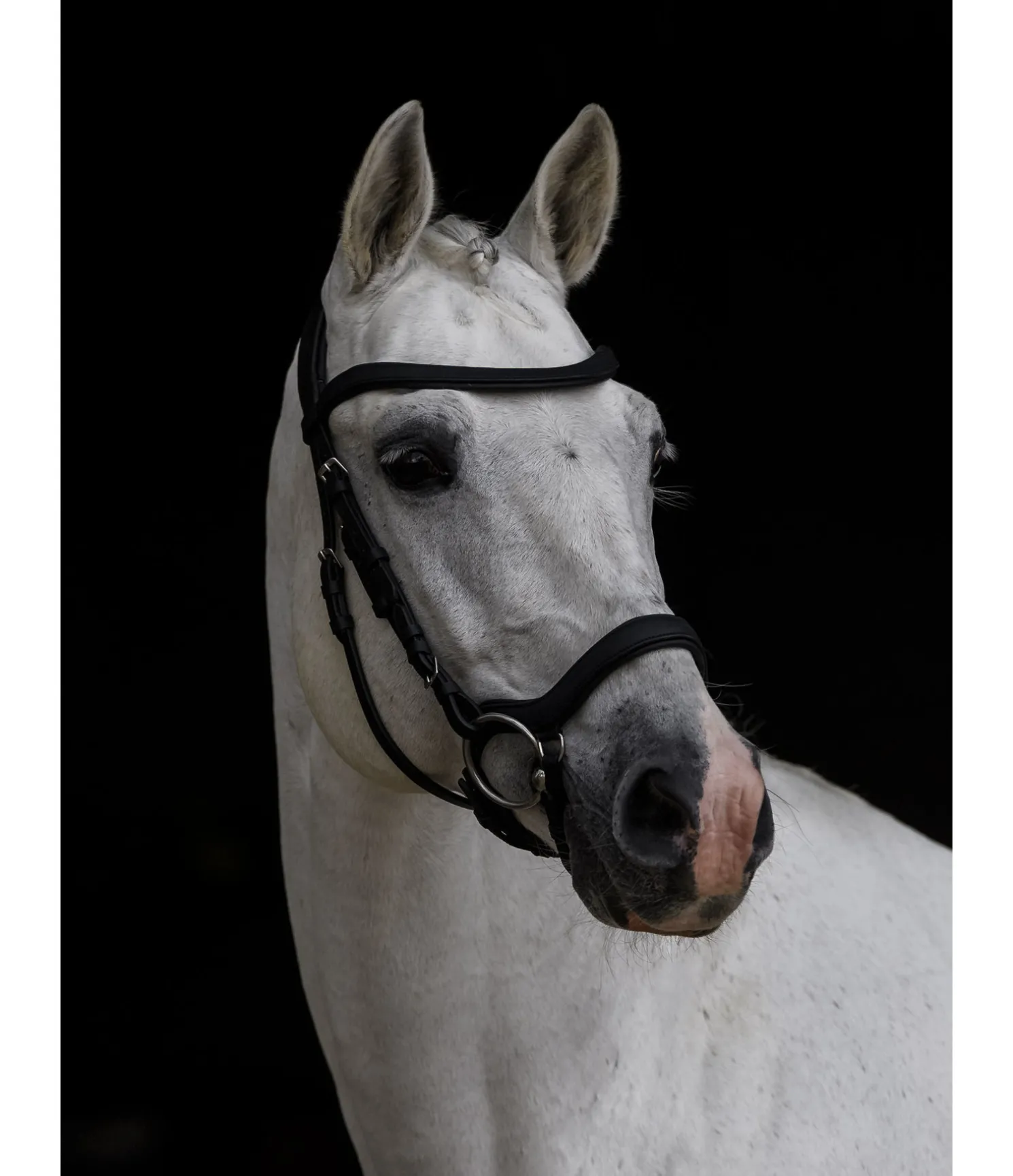 Bridon confortable en cuir gras souple. Muserolle combinant les effets d’une muserolle française et d’une muserolle allemande. Les anneaux de fixation latéraux du noseband permettent d’éviter les pressions sur l’os du nez, facilitent la fermeture et offrent davantage de liberté aux naseaux. Têtière anatomique extra-large, muserolle, pad de menton et frontal avec doublure extra-moelleuse en cuir véritable. Cuir gras. Bouclerie argentée. Sans rênes, sans mors.
