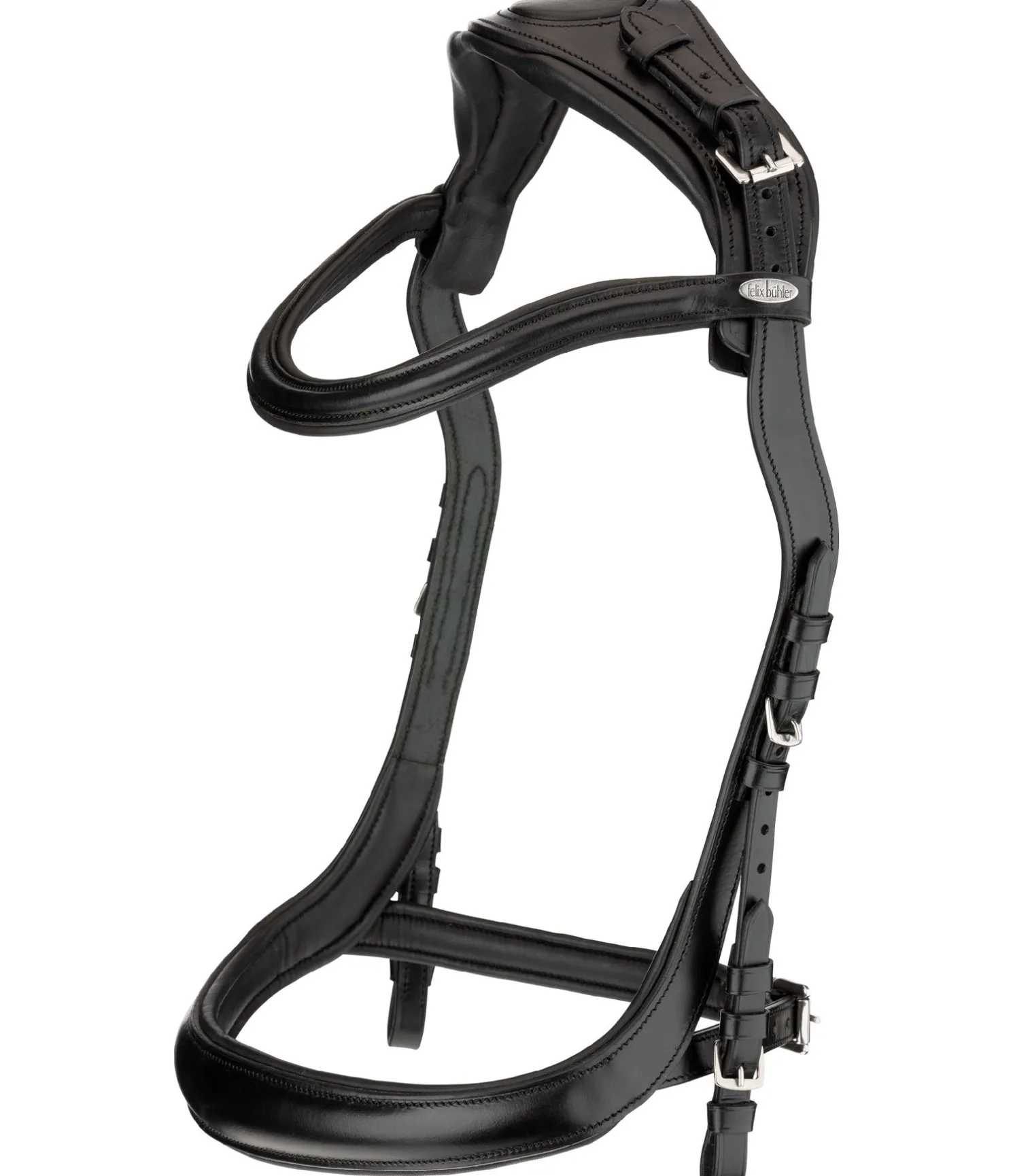 La coupe innovante des montants libère la zone autour des yeux afin d’éviter les pressions douloureuses et de ne pas gêner le champ de vision du cheval. La position basse de la muserolle garantit une meilleure fixité du mors et rend la coupe élégante. Le bridon se règle au niveau de la têtière, ce qui permet de n’avoir aucune boucle faisant pression sur les nerfs sensibles de la tête du cheval. La têtière anatomique large avec découpe aux oreilles est dotée d’une doublure douce en cuir véritable, tout comme le frontal et la muserolle française, pour un confort optimal. Sans noseband, afin d’éviter les pressions sur l’os du nez et de permettre une meilleure mastication. Cuir gras. Bouclerie argentée. Sans rênes, sans mors.