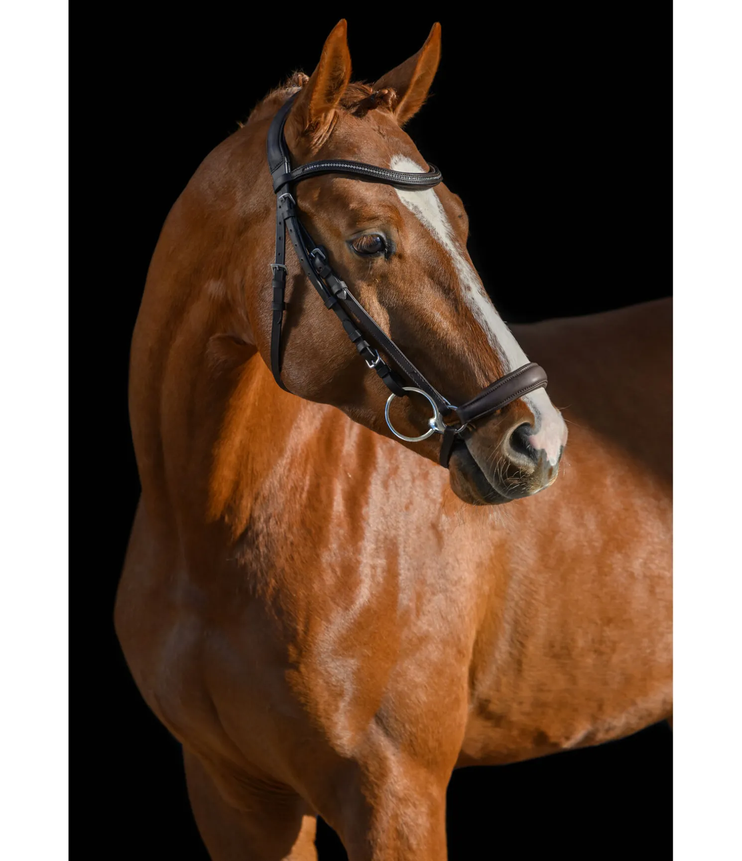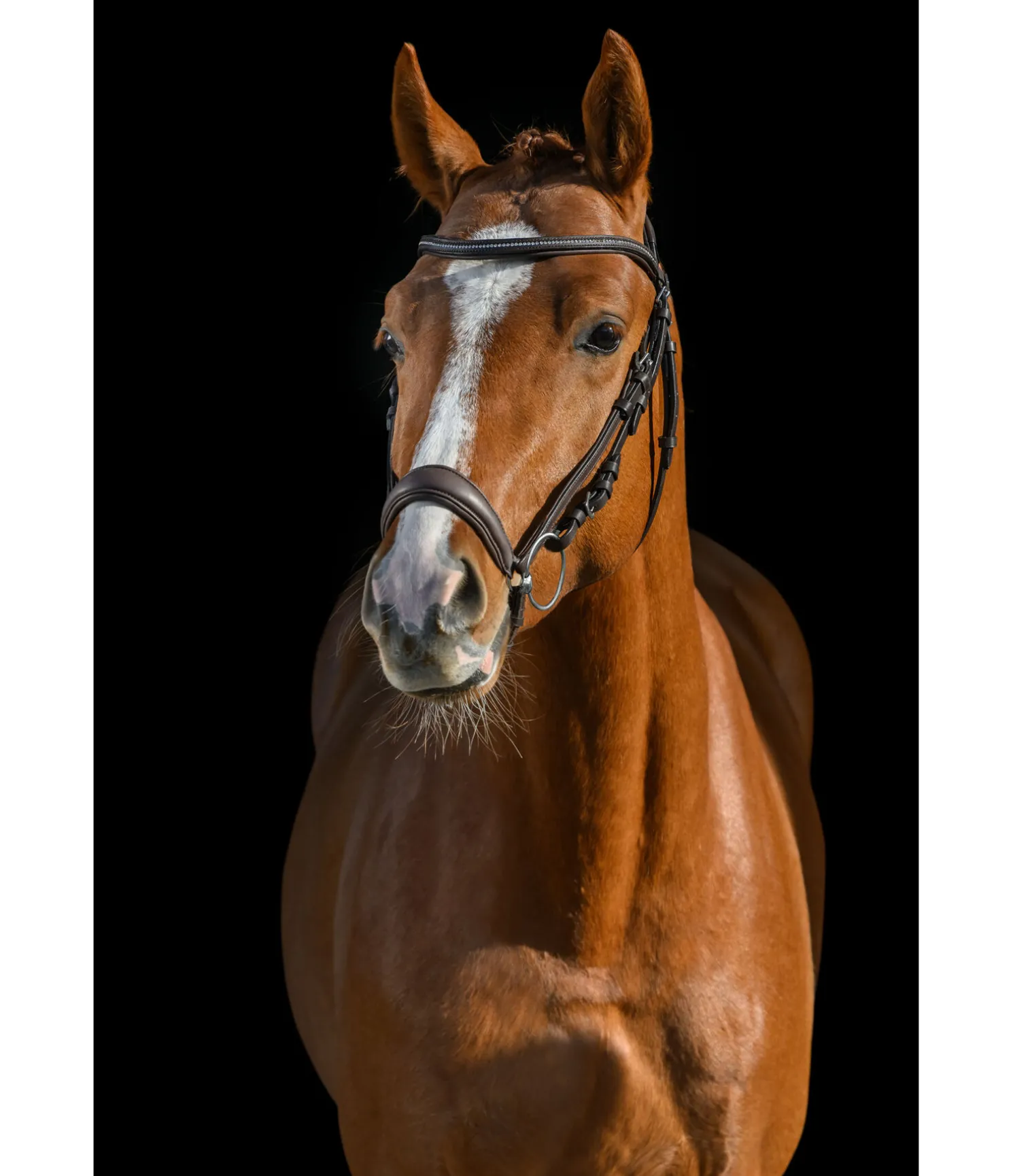 Bridon particulièrement doux avec muserolle allemande. Têtière anatomique. Frontal vague orné de petits strass scintillants. Têtière, frontal et muserolle avec doublure moelleuse en cuir véritable. Bouclerie argentée. Sans rênes et sans mors.